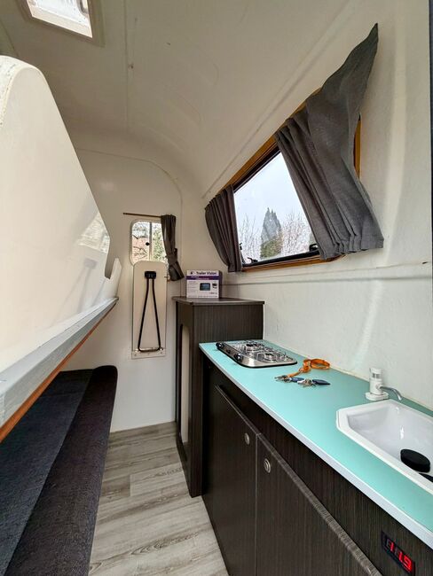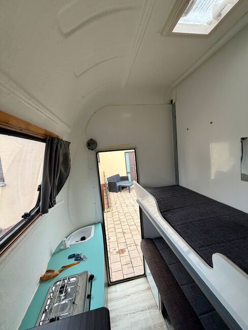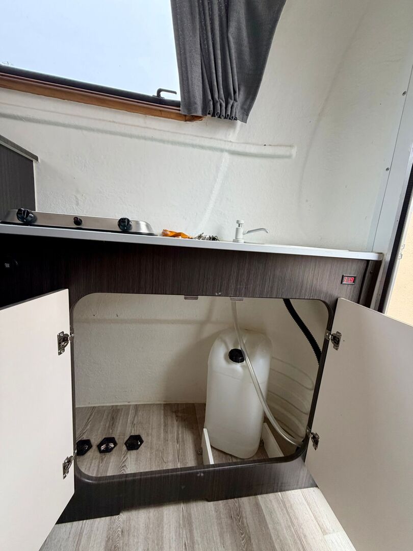 - Gasaansluiting apart, naast toegangsdeur naar woongedeelte - Stapelbedden om te bouwen tot zitgroep - Dakluik met vliegennet in woongedeelte - Klaptafel - Verschillende opbergvakken - Gasfornuis - Schuifbare zijramen - Scharnierend voorraam - gootsteen - watertank - Nieuwe accu - Afsluitbare deur