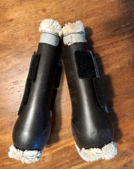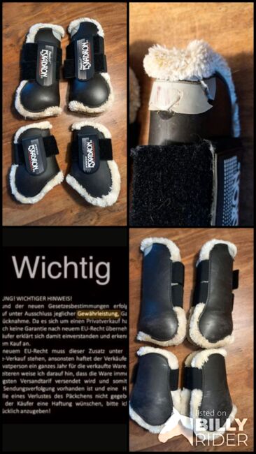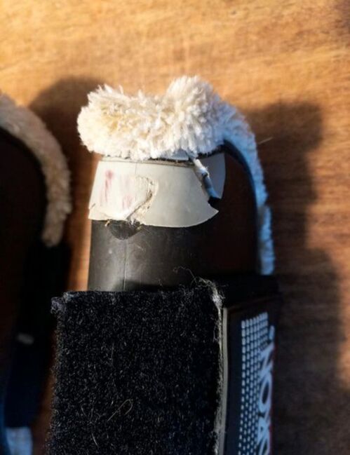 Eén slobkous heeft helaas een kleine beschadiging volgens de foto. Voor de rest zijn de beenkappen en kogelbeschermers in zeer goede, gebruikte staat. NP samen was 120 €.