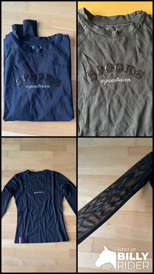 Ik verkoop een nieuw Spooks shirt met lange mouwen in zwart met zwarte glitterbelettering en lichte mesh mouwen. Geweldig voor zomerse temperaturen of onder een wedstrijdjasje. Het shirt is helemaal nieuw en is nooit gedragen. Aangezien Spooks is gestopt met de productie, wordt dit shirt niet meer gemaakt.