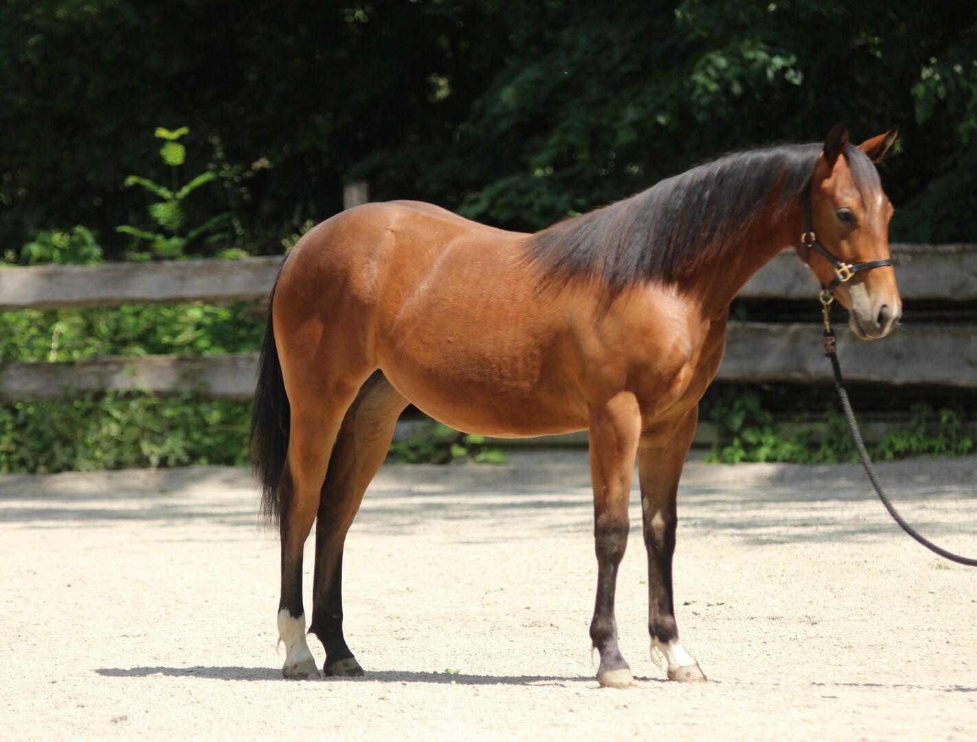 ...is een zeer mooie en correct gebouwde Amerikaanse Quarterhorse jaarling merrie in de kleur Bay (vos). Ze groeide op onder de beste omstandigheden in een kudde en met dagelijks menselijk contact. Ze is geboren op 4/24 en komt uit een Duitse fokkerij.