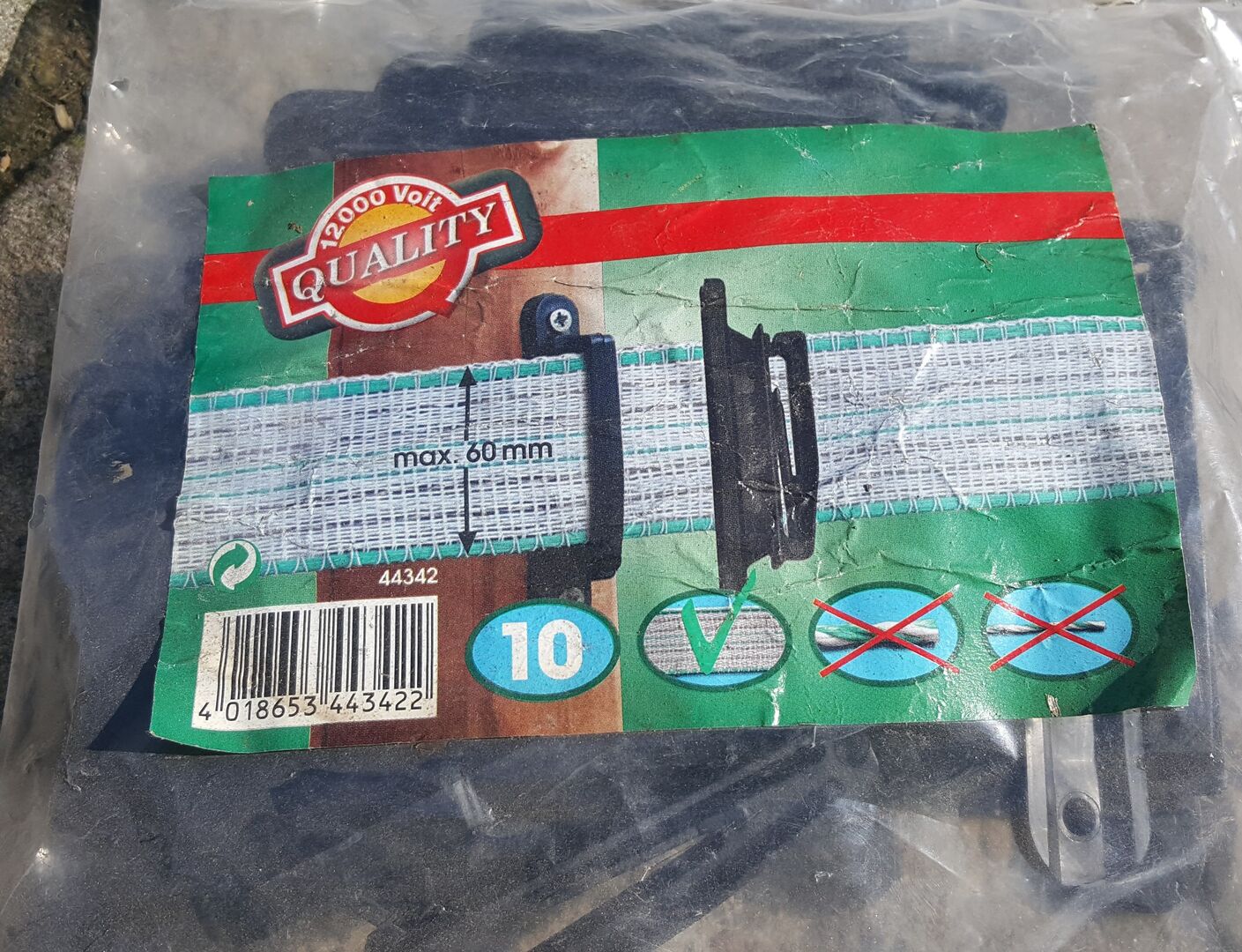 10 breedbandisolatoren voor 60 cm gevlochten draad - Praktische brede tape isolator "Clip" tot 60mm tape met snapslot nog in originele verpakking. Zeer goed en gemakkelijk te gebruiken Prijs per zak 1,50 (stuk 0,15€) Dit is een particuliere verkoop, daarom geen retournering, geen aansprakelijkheid en geen garantie.