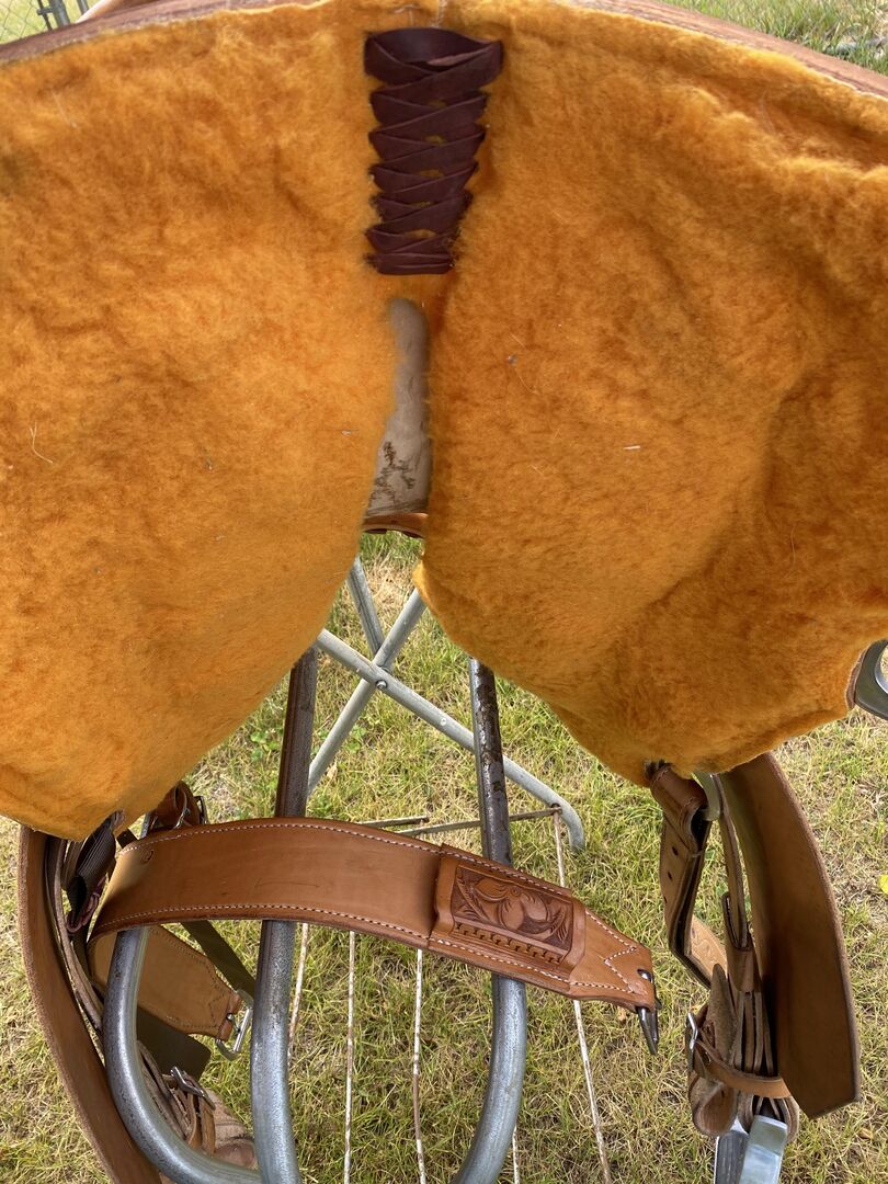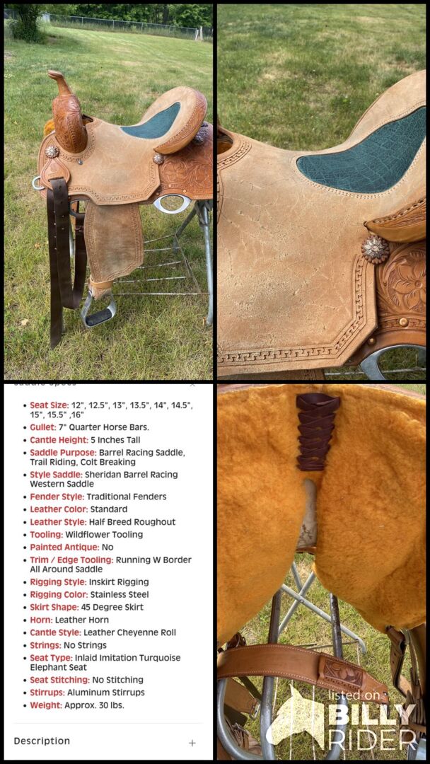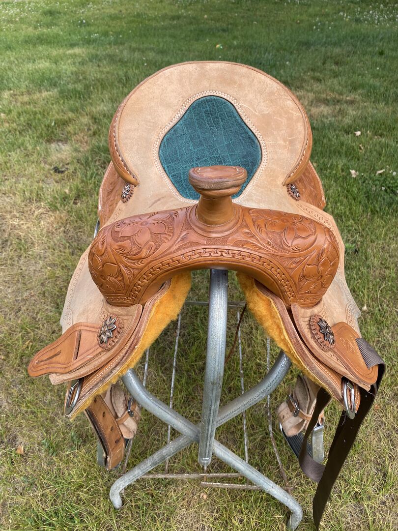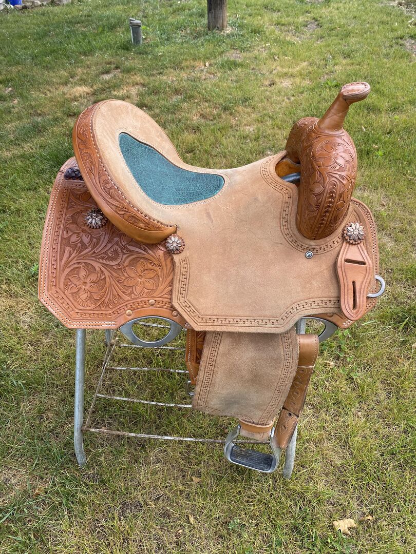 Brand new. Rode in 3 times. 15" seat, 5" Cantle, 7" quarter horse bars. Upgraded conchos. Specs from their website are in the pictures. It will come with the matching back cinch. Selling because the seat is too big for me.