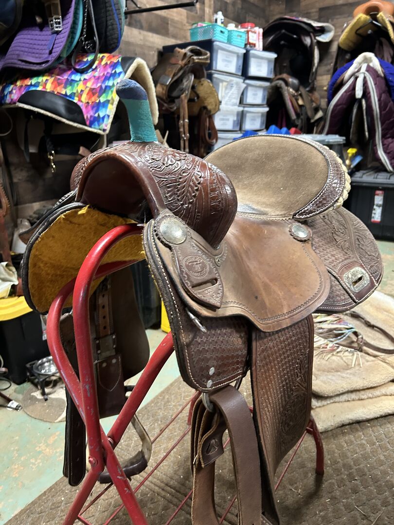 16inch double T, barrel saddle, Good flocking, would fit better for a wide horse, 8inch gullet. Rawhide is unwrapping on the horn (hence the vet wrap.)