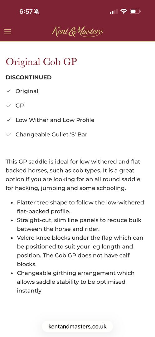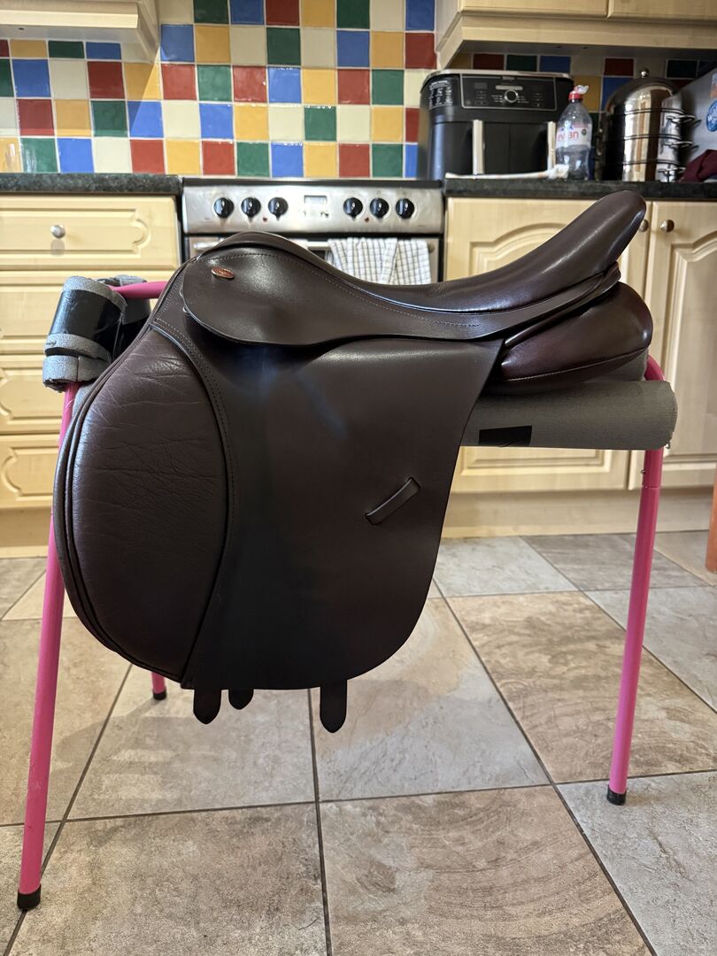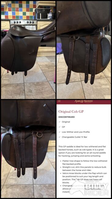 17” Kent & Masters Original Cob GP Saddle in brown Used but in immaculate condition, only for sale due to my mare retiring Always been kept and used with a cover on, no marks or imperfections, checked 6 monthly by a saddle fitter Currently has a medium gullet in but I have the wide/extra wide, extra wide and extra wide/extra extra wide s-gullets that I could sent at additional cost