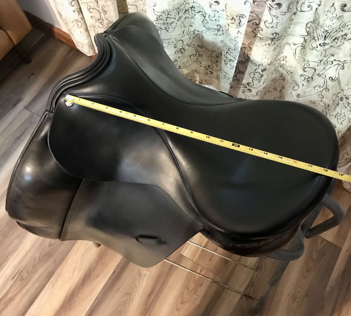 18” Detente Isis. Wide tree is 6” fits a bit more towards a generous medium wide. Flaps are 16.5” long. Open seat with lots of room for your seat bones. Saddle is black with blue piping, bottom panels are faded and do look brown. Wool flocked. There are two small spots on underside of one flap that could be repaired but do not impact use. Bought used from Pelham saddlery January 2023, my horse was fat from being out of work and this saddle is now too wide for him. Paid $1800 for it, Reasonable offers.