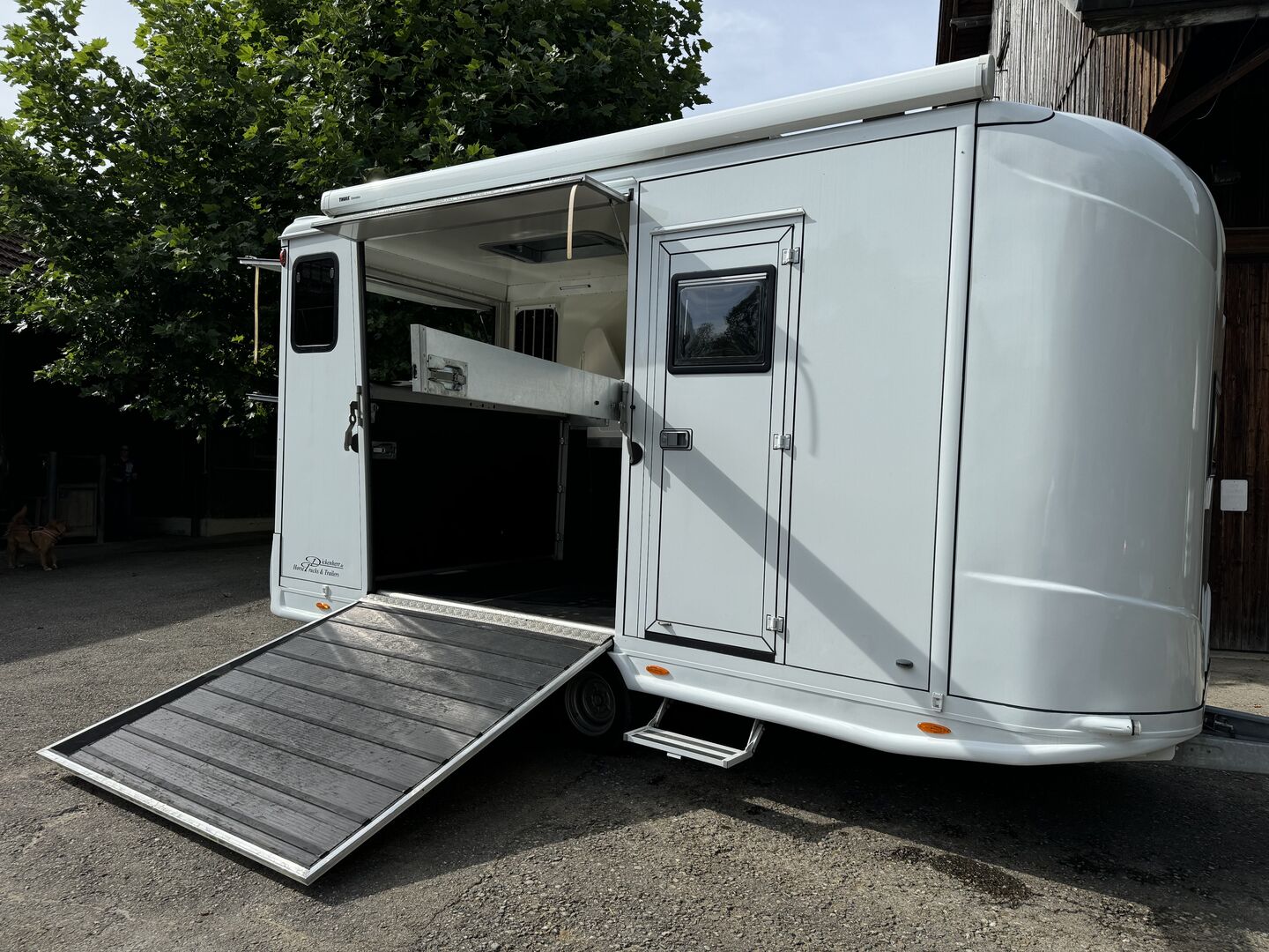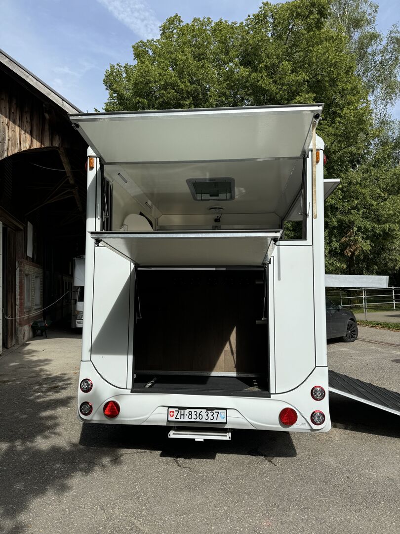 Anhänger mit Wohnbereich. Dusche/Wc/ Spühlbecken, Kühlschrank. AC/ Heizung. Solar. Bett sind 120cm breit. Pferde fahren Rückwärts super bequem. Kamera im Fahrtbereich und Rückfahrt Kamera. Sattelkammer hat platz für Westernsattel und Englischsattel. Sattelwagen auch möglich. Steht in 8634 Hombrechtikon. Leergewicht 1980, gesamtgewicht 3500.