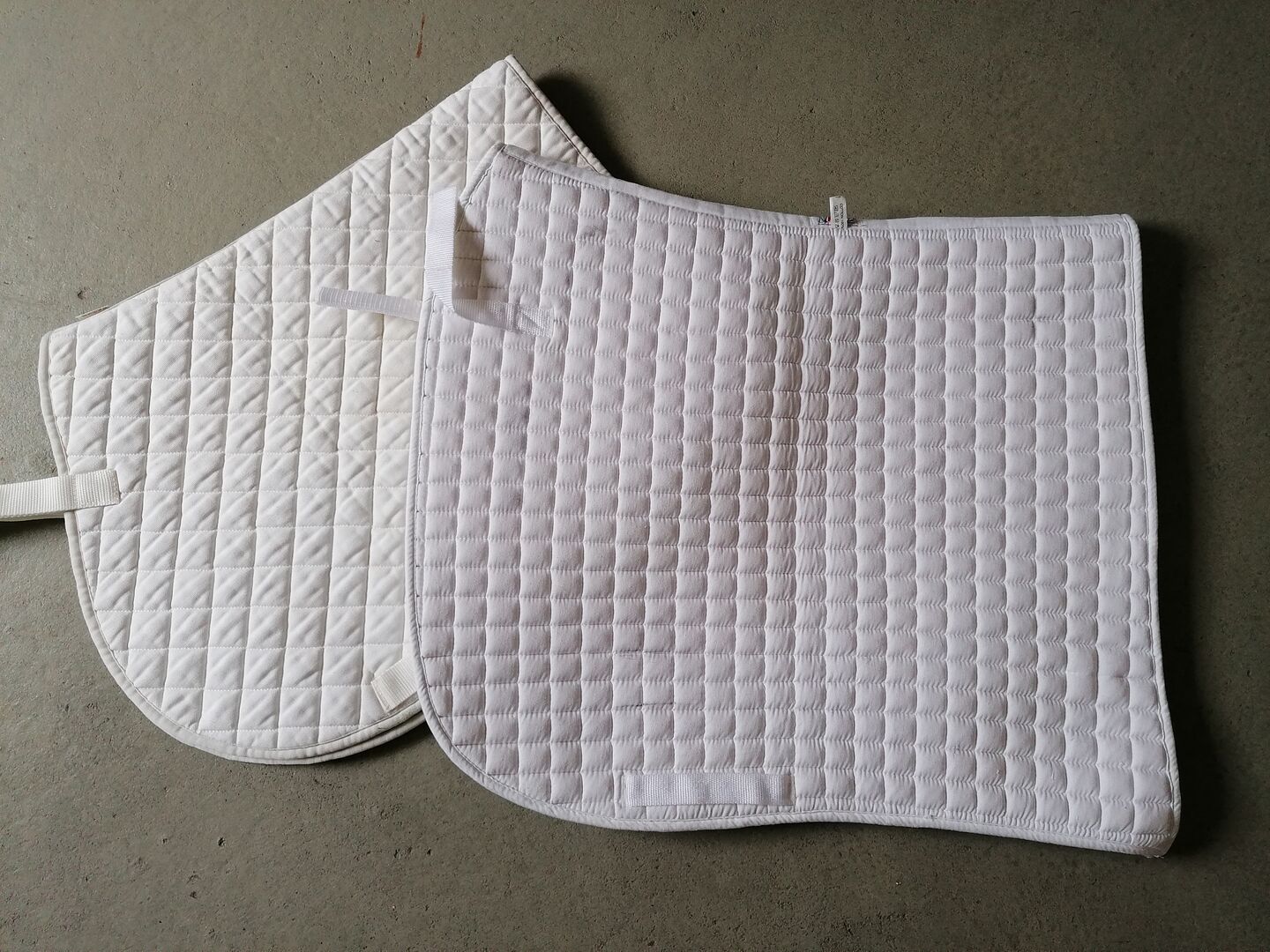 2 witte zadeldekjes / zadeldekjes - Aanbieding 2 witte zadeldekjes (1x dressuur, 1x VS). Het dressuurzadeldek is nieuw en het VS-zadeldek is maar één keer op het paard geweest en daarna meteen gewassen. Aangezien dit een particuliere verkoop is, is ruilen of garantie niet mogelijk.