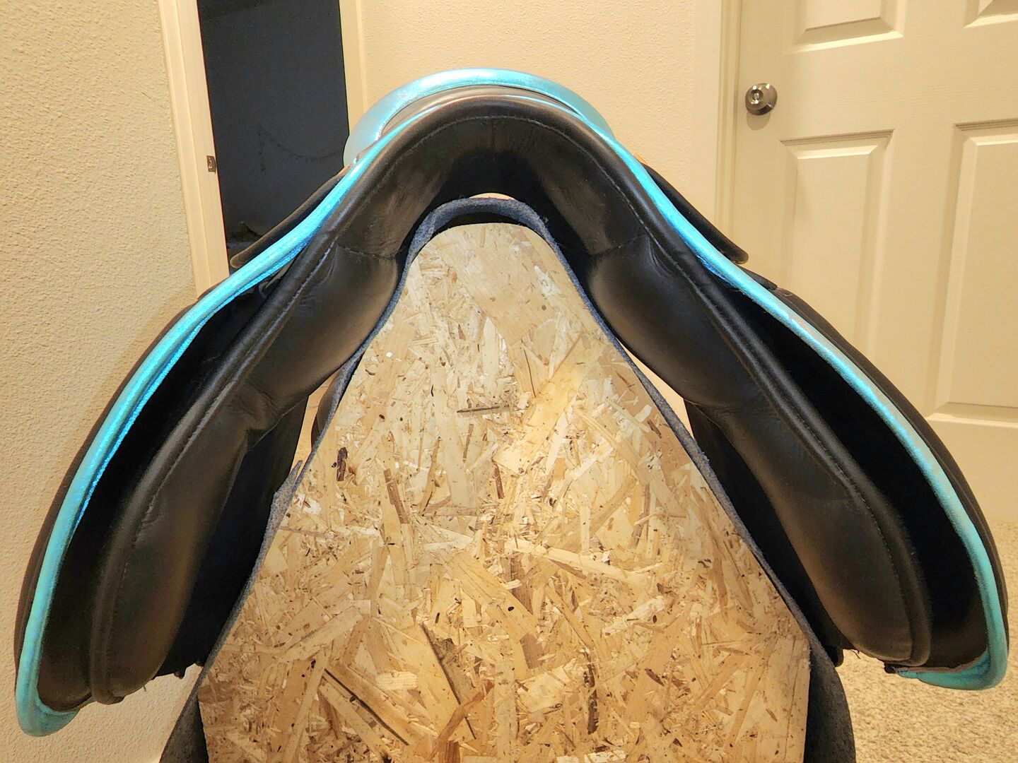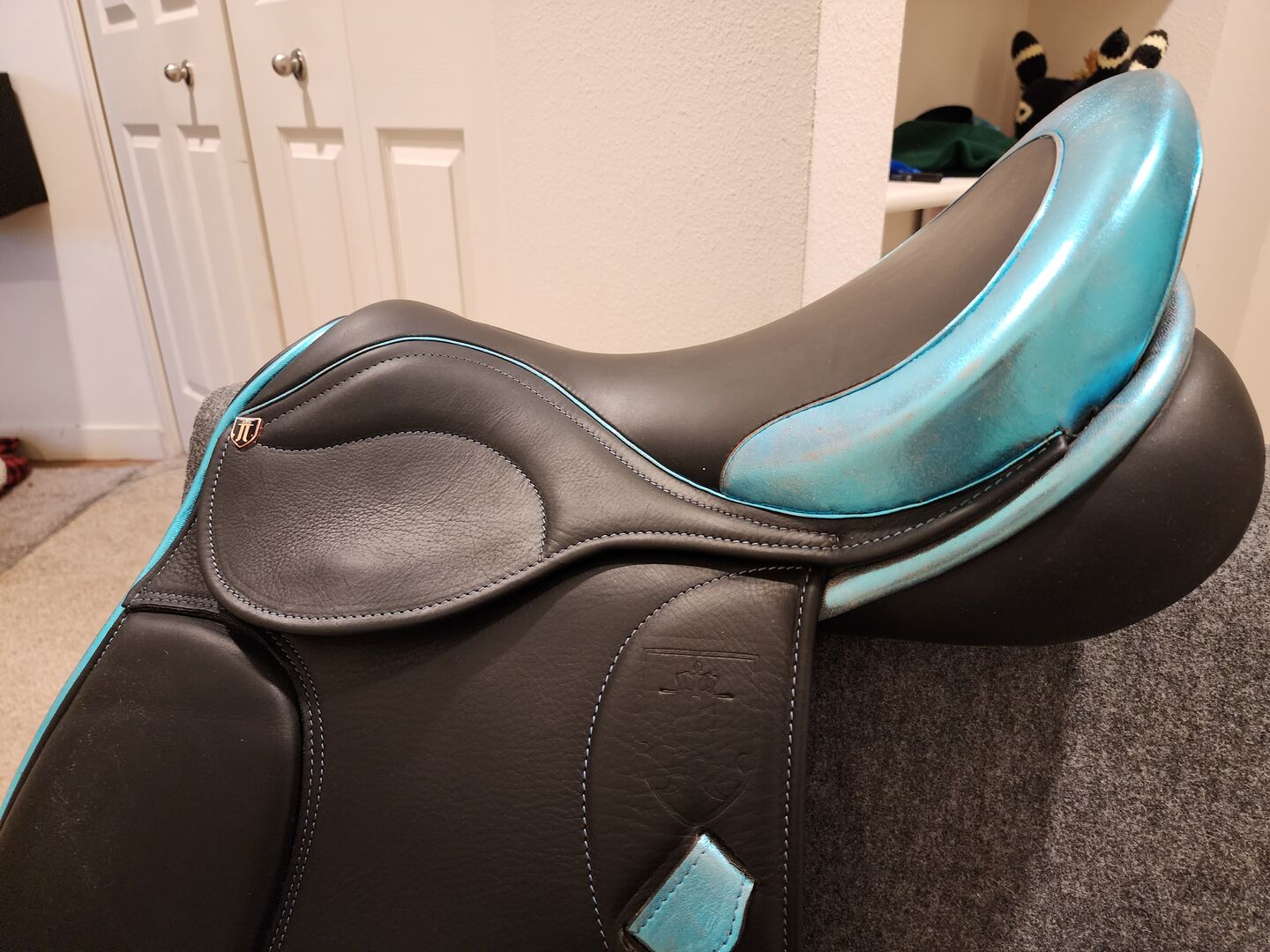 Black calfskin leather Metallic teal piping, stitching, keepers, seat top ad edging Flexible Tree Extra comfortable memory foam seat (18" seat) Dual flap U Headplate Adjustable gullet system Intelligent double wool flocked panels (great for short backed horses) Safety stirrup bar Shoulder relief panels Interior velcro knee and interior knee blocks Short girth straps