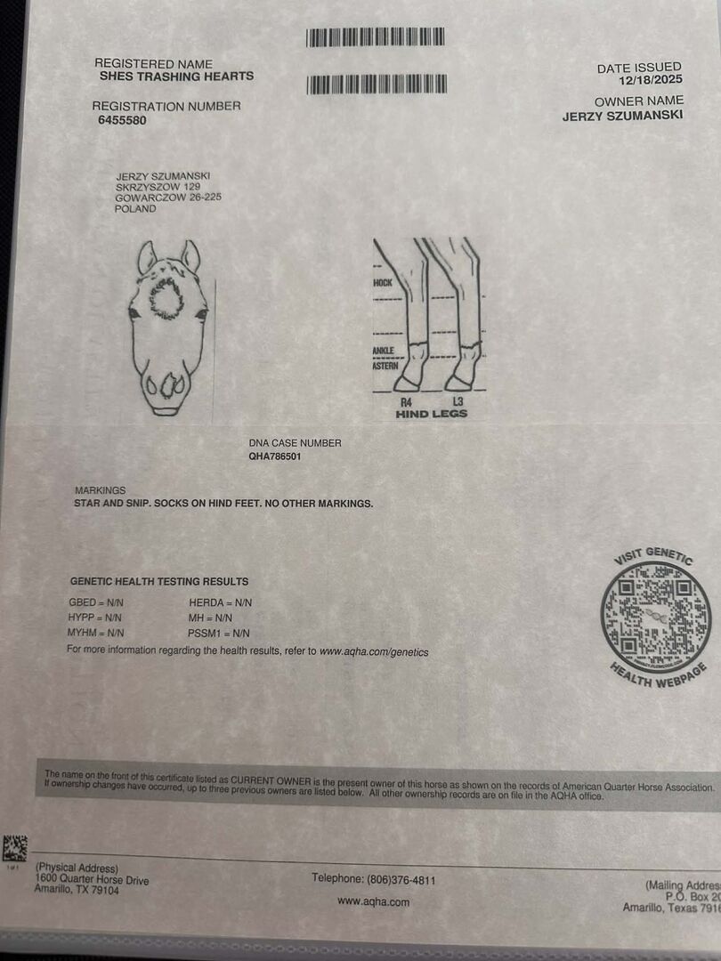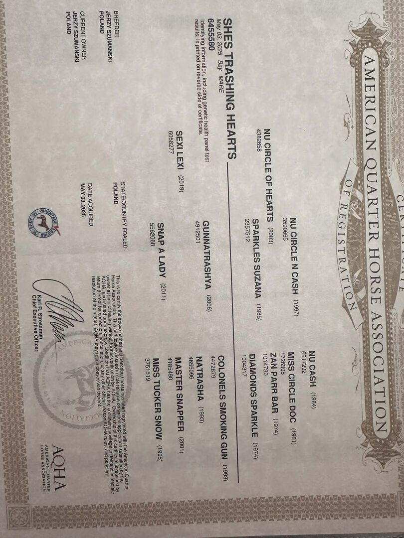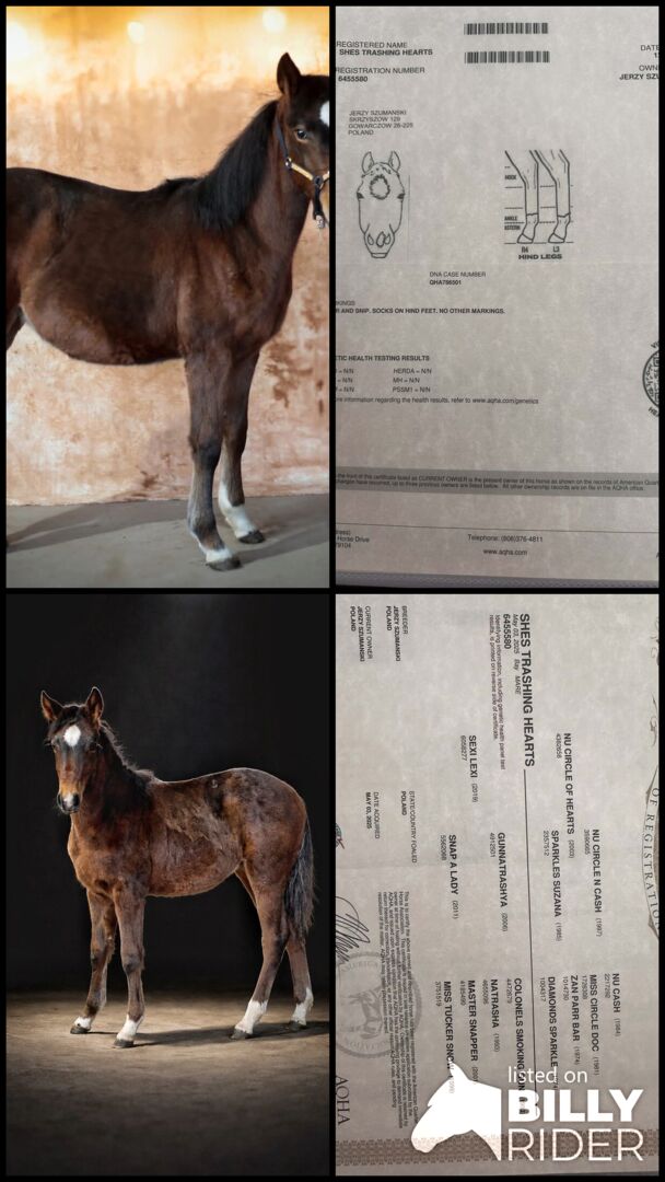 Deze merrieveulen heeft alle goede en oude bloedlijnen in zich. Hij werd gefokt en grootgebracht door Carol Rose zelf. Zijn moeder was succesvol in de USA futurity en won daarna de Derby. Zijn vader had veel succes in het koeienpaard. Nu Circle Of Hearts heeft een Canadese en Poolse futuritykampioen voortgebracht met een zeer beperkt aantal veulens. Deze merrieveulen is sterk gebouwd en een eigen dochter van Gunnatrashya! Dit is haar eerste veulen. Ze is dapper, sterk en slim. Kent alle basisprincipes en is begonnen met grondwerk.