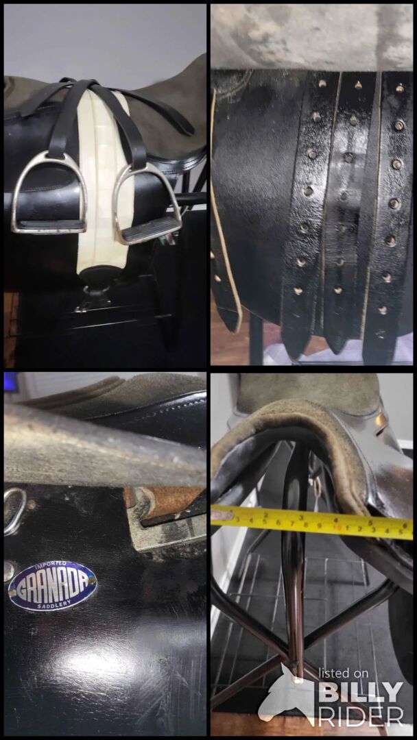 21" Granada Cutback or saddle seat saddle. Has been redyed and sealed. Leathers, irons, girth, pad (not pictured, needs washed before use) and bridle (not pictured, needs oiled and reins need a buckle replaced).