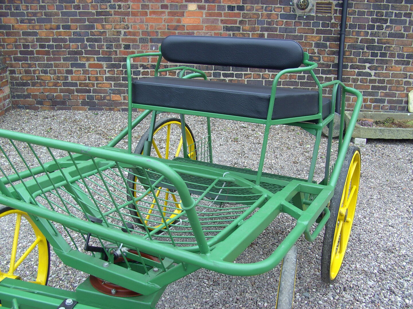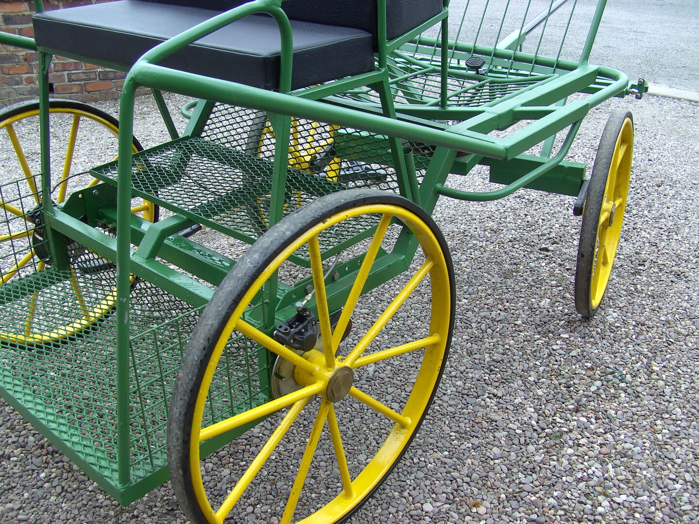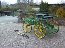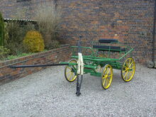 4 Wheel vehicle dual purpose, single horse or pony pairs. With back-step, groom seat, roller bearing turn table, disc brakes, extending axles 125 and 138, with sprung pole and set of shafts for single use. Superide suspension.