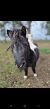 Zwarte pinto merrie, 7 jaar jong, ongeveer 80cm kort, nieuwsgierig, knuffelig en met veel charme.