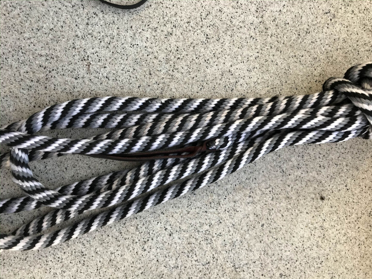 5/8 Bosal zwart-wit - Hier kunt u een gebruikte Bosal in 5/8 kopen van Tackroom Ratingen. Hij past goed op een neus van 58-62 cm (zie foto's). Het bosal is slechts zo gevormd dat het op de neus van een paard past en kan zonder problemen verder worden gevormd. Wat de flexibiliteit betreft, is zij eerder middelmatig.