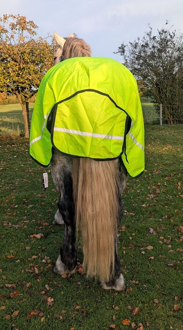 600D Ripstop Epoch speciale deken buitenstof 3000mm waterkolom fluorgeel met reflecterende strepen, zeer ademend volgens de fabrikant van -20° tot + 45° (zie label), Fleece vulling op schoft, nek en schouderstukken, getapete naden, 100% winddicht, 100% ademend, 100% waterdicht, 100g op de rug, bontvriendelijke tafzijde aan de onderkant T-borstsluiting met rubberen ring om onbedoeld openen te voorkomen, kruissingels met rubberen ring om onbedoeld openen te voorkomen, diepliggende staartflap, bovenste staartkoord, onderste riem met karabijnhaak voorkomt dat de deken opvouwt tijdens het oprollen, met zak met ritssluiting