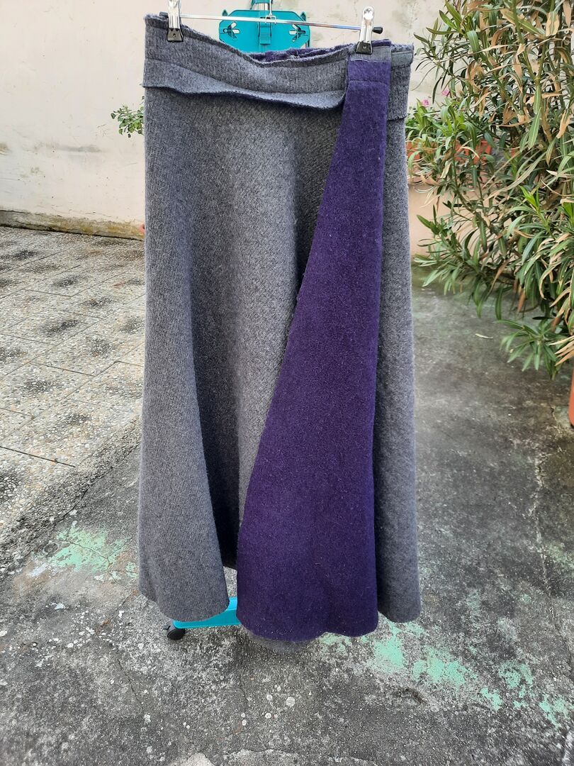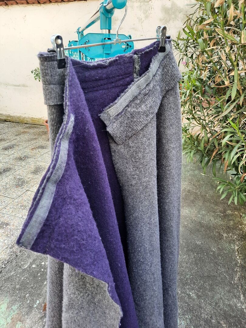 Academische rok - Rok van wolvilt buiten grijs en binnen paars lengte 114 cm .