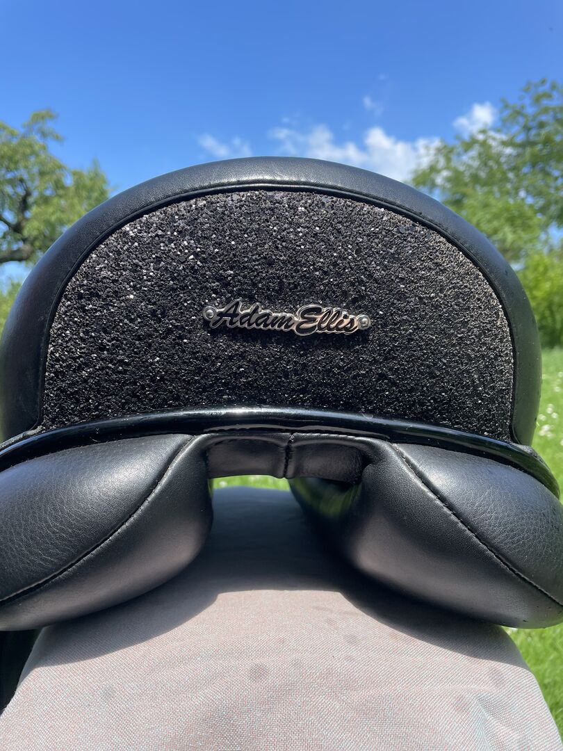 Adam Ellis "Pelle" Dressuurzadel 17,5" - Gebruikt dressuurzadel "Pelle" van Adam Ellis Zadelmaat 17,5" zwart Buffelleer zadelkleppen Bevestigde knierollen Achterframe zwart gelakt 2 kristallen aan de voorkant Stardust galop zwart