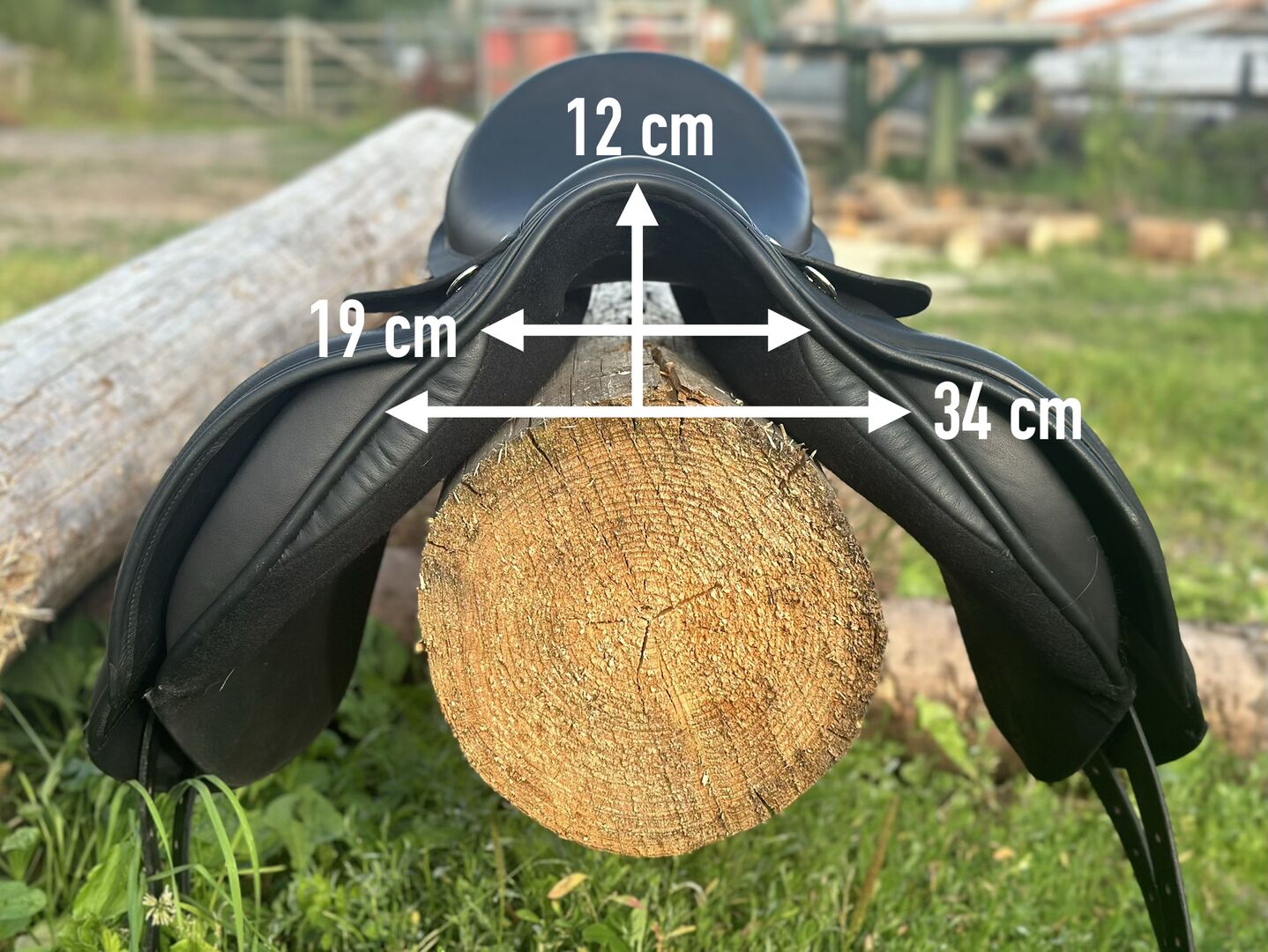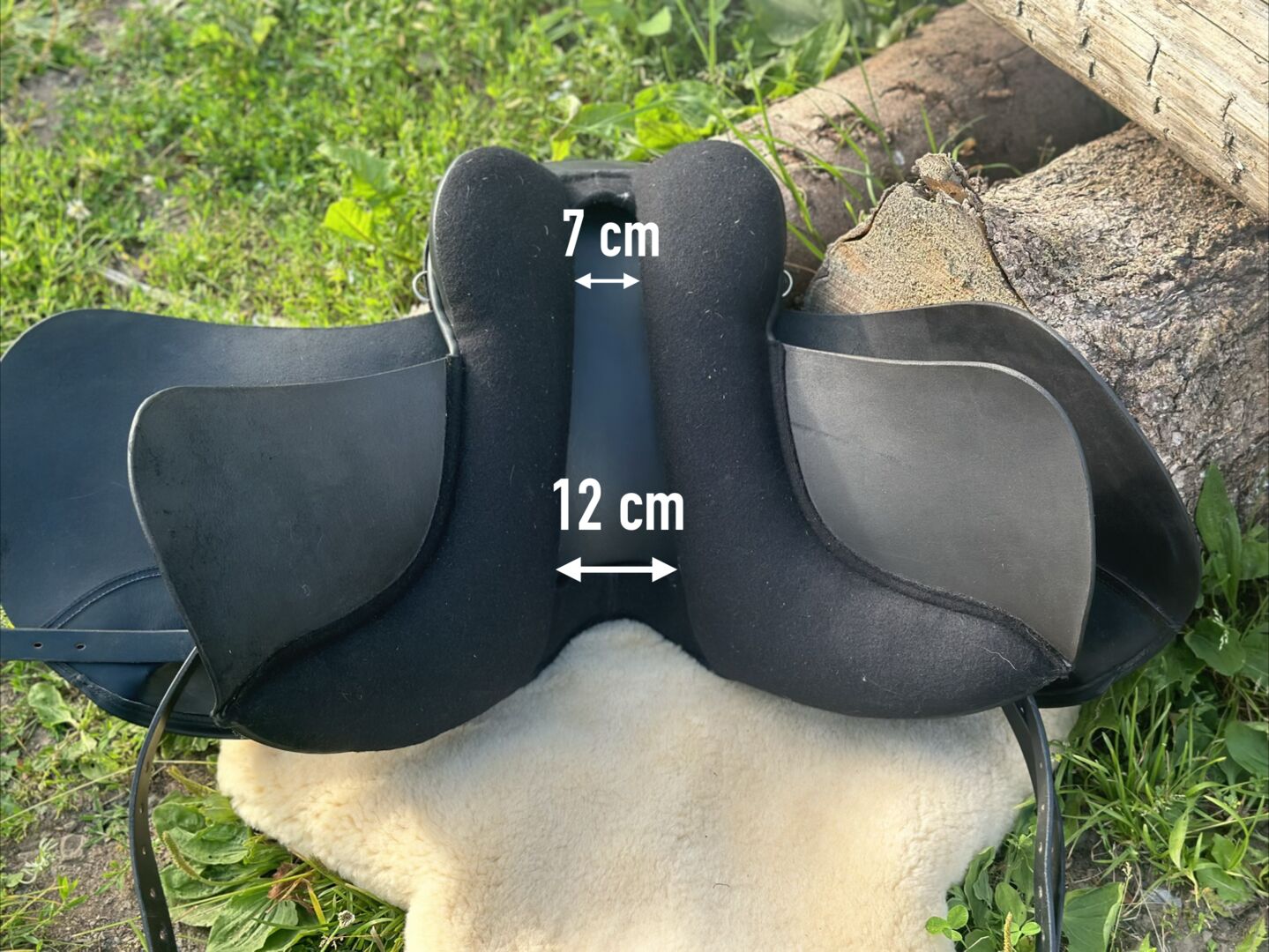 All-round zadel voor vrije tijd, dressuur & tölt - Proefzending - IJslandse Haflinger Tinker COB - Kort, comfortabel all-round zadel voor vrije tijd/dressuur & tölt - past op ronde paarden met lage schoft, rechte tot licht gebogen rug. 17" zit - slokdarm ca. 40 cm (totale lengte 43 cm) - KW 34 - breed wervelkanaal (zie foto's voor afmetingen). Verzending op goedkeuring (verzekerd met DHL-trackingnummer).
