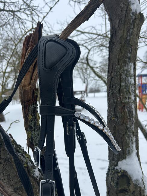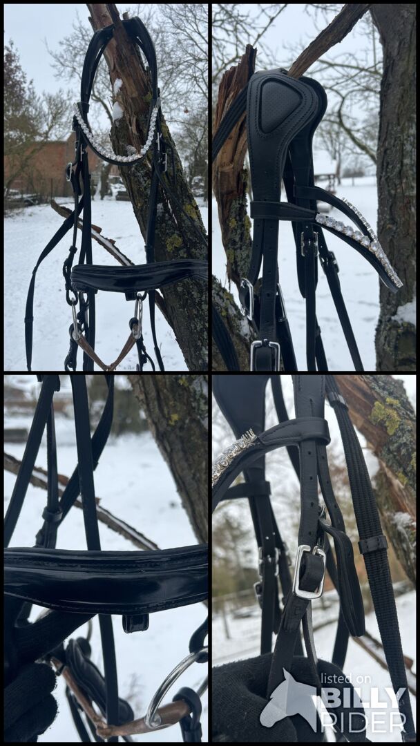Het hoofdstel is gemaakt van zwart kunstleer en heeft de volgende kenmerken: - Maat COB - geschikt voor de meeste warmbloedpaarden - Teugels zijn inbegrepen - Bit kan als optie gekocht worden - Frontriem met stenen decoratie -Anatomisch kopstuk