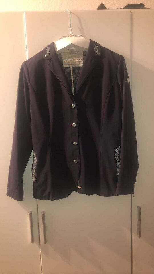 Animo damesjas D36 blauw glitter - Te koop is een gebruikte jas van Animo in maat D36 met prachtige glitter applicaties.