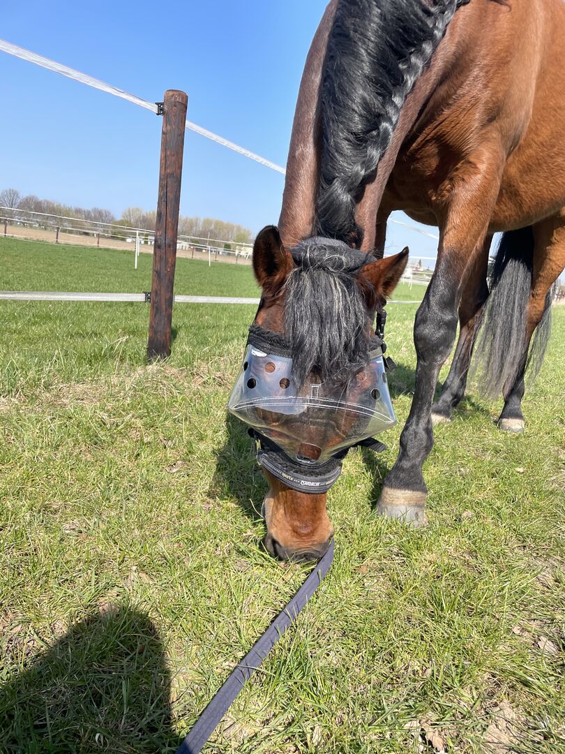 Aniprotec Equivizor Oogbescherming UV-masker Paard COB - Ik verkoop een Equivizor oogbeschermingsmasker. Het masker is gekocht vanwege een oogoperatie, slechts 2-3 keer gedragen omdat het een beetje te klein was. Aan het masker zijn ook zachte kussentjes bevestigd. Opbergtas is inbegrepen. Maat COB. NIEUWE PRIJS: 249,00€