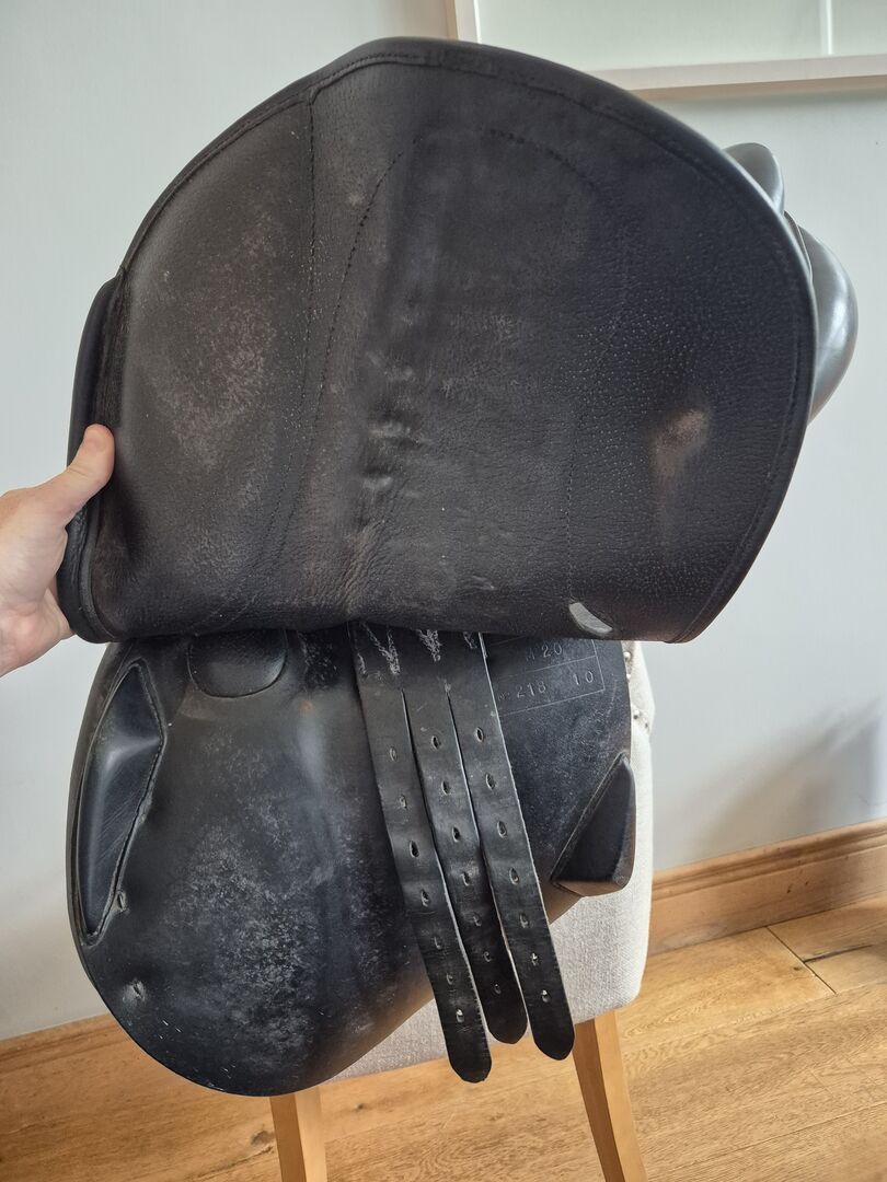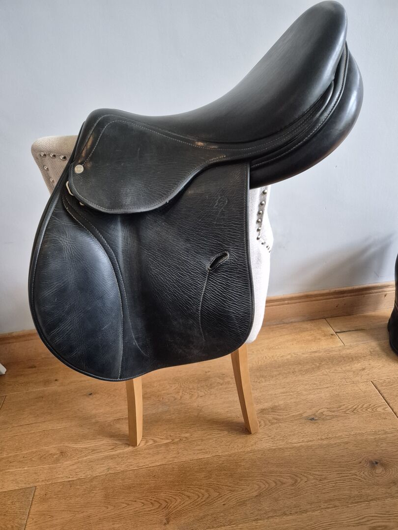 Antares France black 17.5 inch saddle. This is a very comfortable saddle to ride in. I had it for a 15.3 medium build high wither horse. It is missing one logo button on flap and one girth guard.