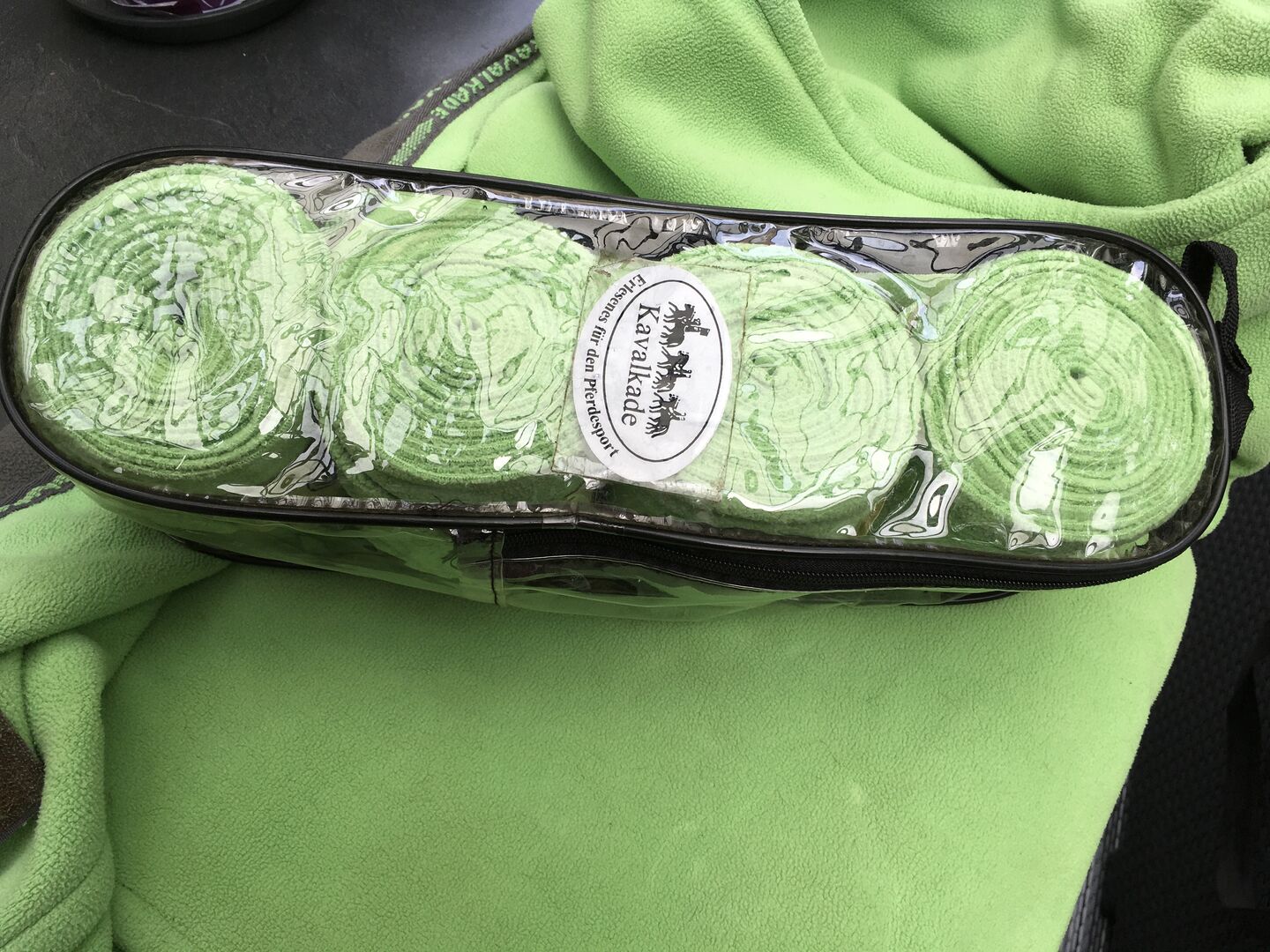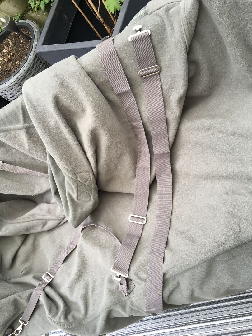 Appelgroen zadeldek met kruissingels - Gebruikte zweetdeken in appelgroen met grijze kruissingels voor een stevige pasvorm inclusief bijpassende surcingles. Een echte blikvanger! Afmetingen: 155 cm