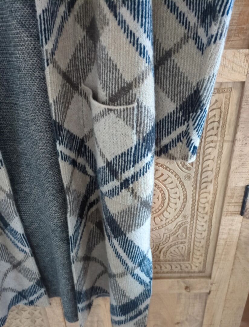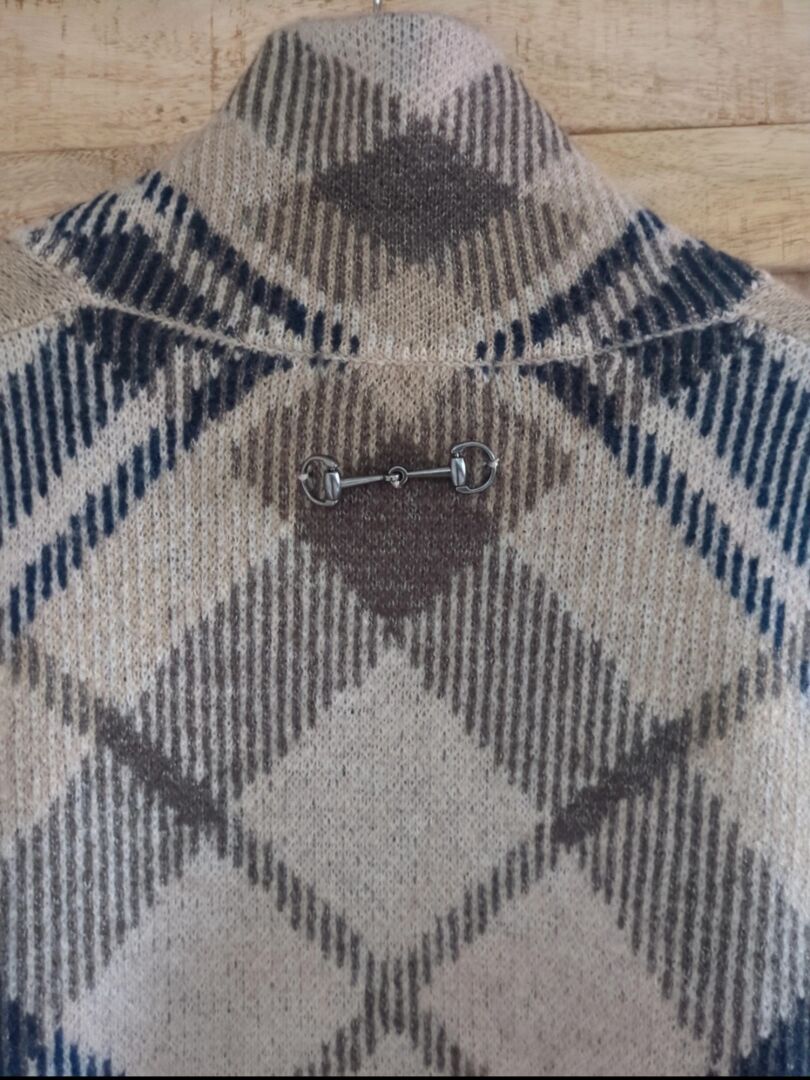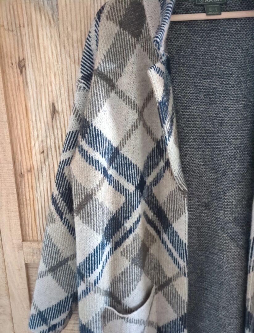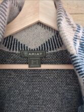 Ariat Vest - Prachtig vest van ariat in beige-blauw-bruin patroon, maat M. Nieuw en ongedragen. Met steekzakken aan de voorkant en decoratief snaffelbitje aan de achterkant. Met wol. Nieuwprijs 165€.
