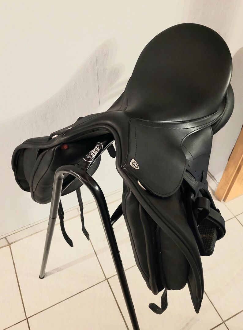 Bagual dressuurzadel Sapucay - Bagual dressuurzadel "Sapucay" in 17" in zeer goede staat. Het is slechts zelden gebruikt, lederen stijgbeugelriemen en stijgbeugels in zwart zijn inbegrepen. Het was gemonteerd op mijn Konik en is alleen nagekeken door de zadelmaker. Ik geef het alleen weg omdat ik me niet prettig voel in een dressuurzadel.