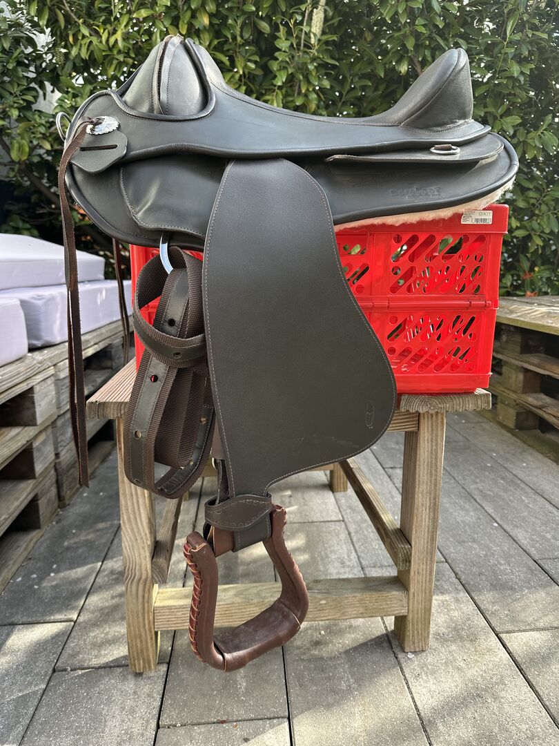 Koeienhuid, 6 D-ringen, conchas met leren riemen, western tuigage. Uit billet en bindriem (nylon). De westernfenders kunnen vrij geplaatst worden of vervangen worden door andere stijgbeugelriemen.