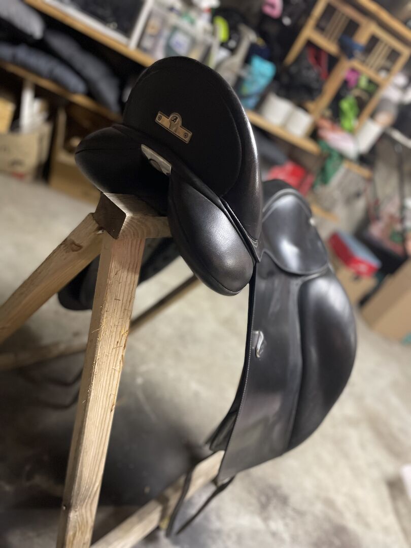Bates dressuurzadel 17,5 inch - Ik verkoop mijn dressuurzadel van Bates met Cair omdat ik een nieuwe wil kopen. Ik verkoop het met extra pommels en de riser kit om het zelf te kunnen opvullen. De blauwe slokdarmplaat is momenteel gemonteerd.