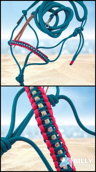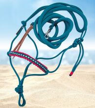 Bergkristallen knoop halster PONY met touw Petrol Roze - Set bestaande uit een halster met strass-knoop en een halstertouw van 2,5 m. Petrol en roze neusversiering. Handgemaakt door Freespirit Horse Art Knoop halster 6 mm dik, touw 12 mm dik met leren flap