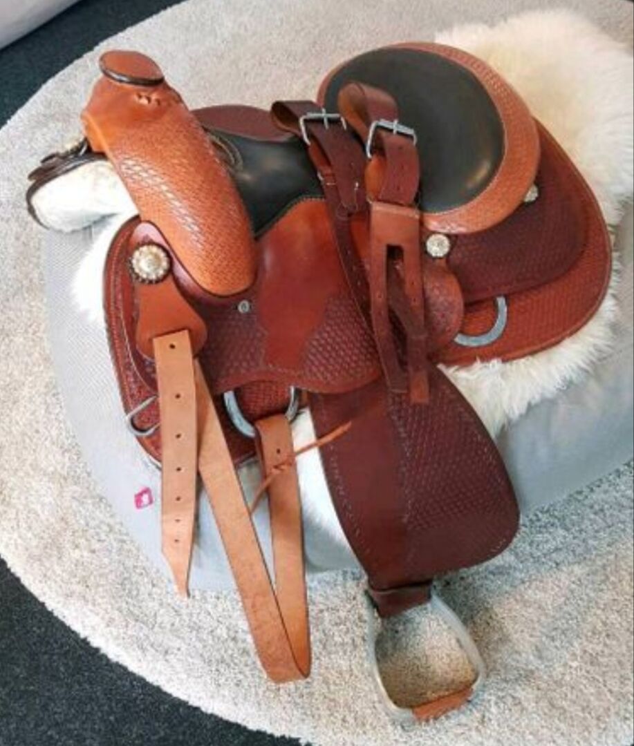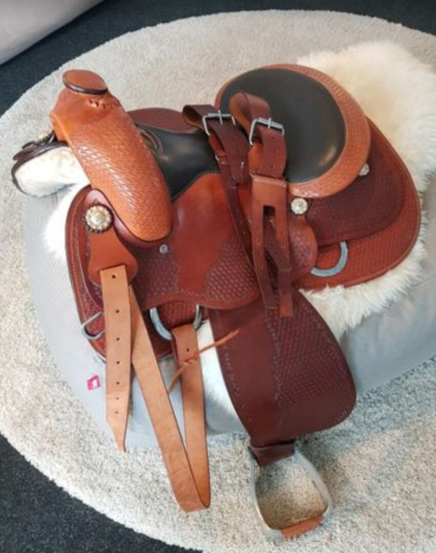 Bijna nieuw westernzadel Platinum Butterfly Skirt Full Quarter - Zeer mooi gestikt leren westernzadel met zilveren conchos, uitgebreide versieringen, aluminium stijgbeugels, zachte zit, goed beencontact en schoudervrijheid door vlinderrokuitsnijding. Zeer licht voor een westernzadel (ik bedoel onder de 10 kilo). Nieuw gekocht, misschien 4 keer op het paard. Was bedoeld voor mijn ritjes met een handpaard, maar was te onbekend voor mij en het paard. Ik bewaarde het voor later en smeerde het in voor opslag. Licht leer - licht verdonkerd door het oliën. Uitgebreide accessoires beschikbaar, afzonderlijk verkocht en niet inbegrepen in de prijs (waarvan sommige te zien zijn op de foto's). Ik blijf bij Engelse zadels, dus hier verkrijgbaar als koopje. 16" Full Quarter voor paarden met een normale schoft. Gemeten van concho tot concho ca. 16cm, zadellengte ca. 67cm. Het is de Platinum versie (de duurste) NP net onder de 1000.- €.