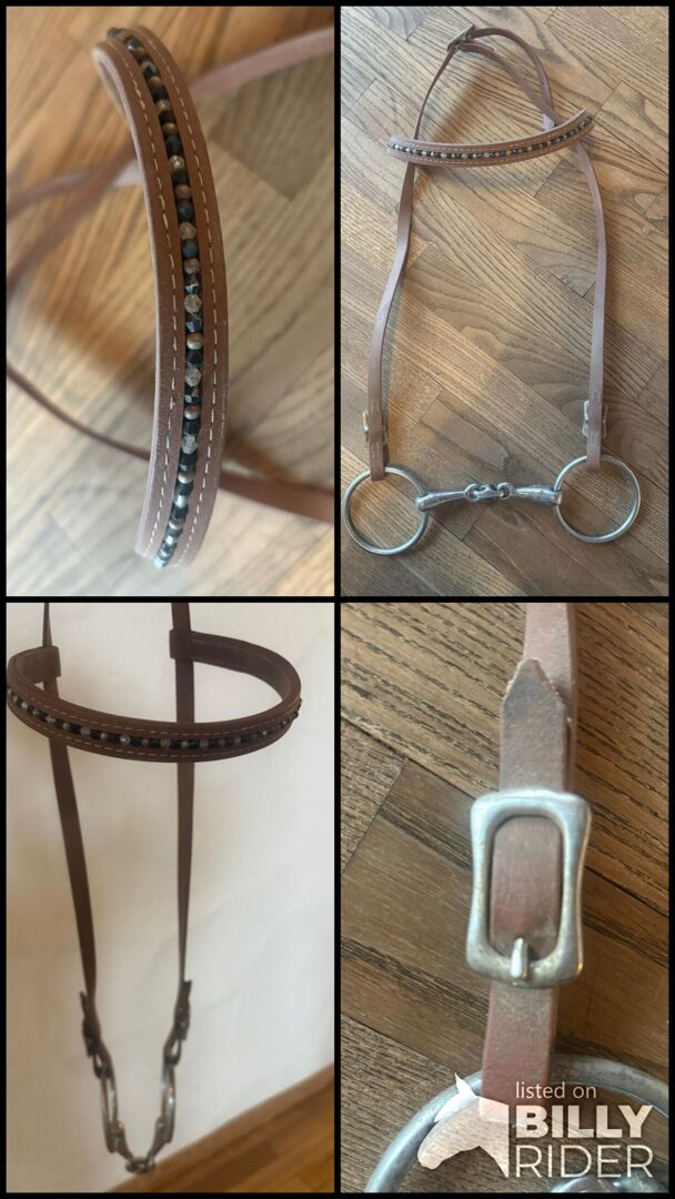 Biothane snaffle in een prachtige cognacbruine kleur - Prachtig biothane hoofdstel van mijn voormalige Isi merrie in zeer goede staat ondanks gebruik van ongeveer 2 jaar. Geweldig materiaal, heel soepel en fijn. Ik heb het met veel plezier gebruikt en was zeer tevreden. De strass steentjes zijn zwart en transparant, erg stijlvol met de witte stiksels.