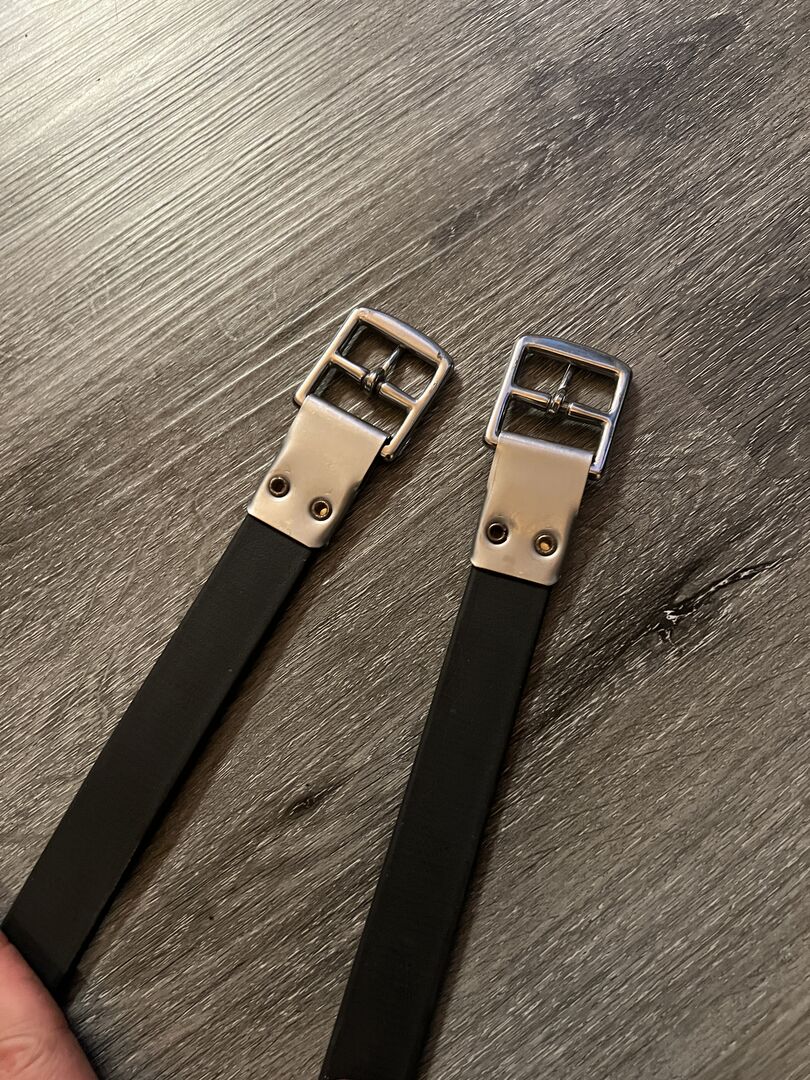 Biothane stijgbeugelriemen 145cm - Te koop hier gebruikte maar in goede staat verkerende stijgbeugelriemen gemaakt van Biothane. De lengte is 145cm. Omdat de riemen van Biothane zijn gemaakt, zijn ze vormvast en trekken ze niet zoals normale leren riemen.