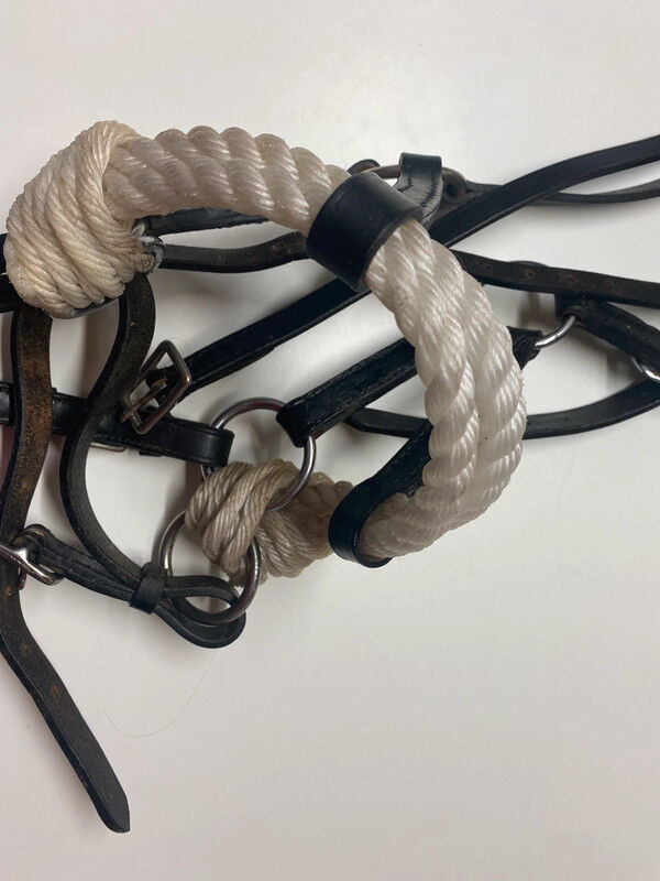 Het hoofdstel is volledig functioneel en het leer is zacht. Op sommige plaatsen is de zwarte kleur een beetje vervaagd en zit er lichte roest op de ringen.