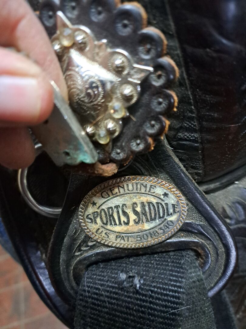 16 inch Boomloos zadel met flower tooling. Roundskirt bDonkerbruin leder. Mist 1 concho. Heeft wat gebruiksspoortjes.