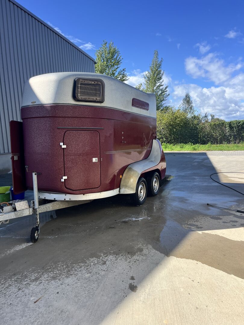 Geweldige trailer met nieuwe remmen, huidige APK, nieuwe veren op de oprijplaat, 3 opbergvakken, de banden zijn 3 jaar geleden ook vernieuwd. De trailer heeft een aluminium vloer en is daardoor vrijwel onverwoestbaar. Er zat een klein scheurtje in het linker spatbord dat gerepareerd is (zie foto 2). De trailer is erg ruim en zelfs als er 2 paarden op staan, kun je comfortabel hoofdstellen zonder dat je klem komt te zitten. De trailer is erg licht van binnen en omdat hij hoog en breed is, kunnen de paarden er makkelijk in. De scheidingswand op de vloer kan ook aan de zijkant worden vastgemaakt, zodat je ook met de trailer wijd open kunt rijden.