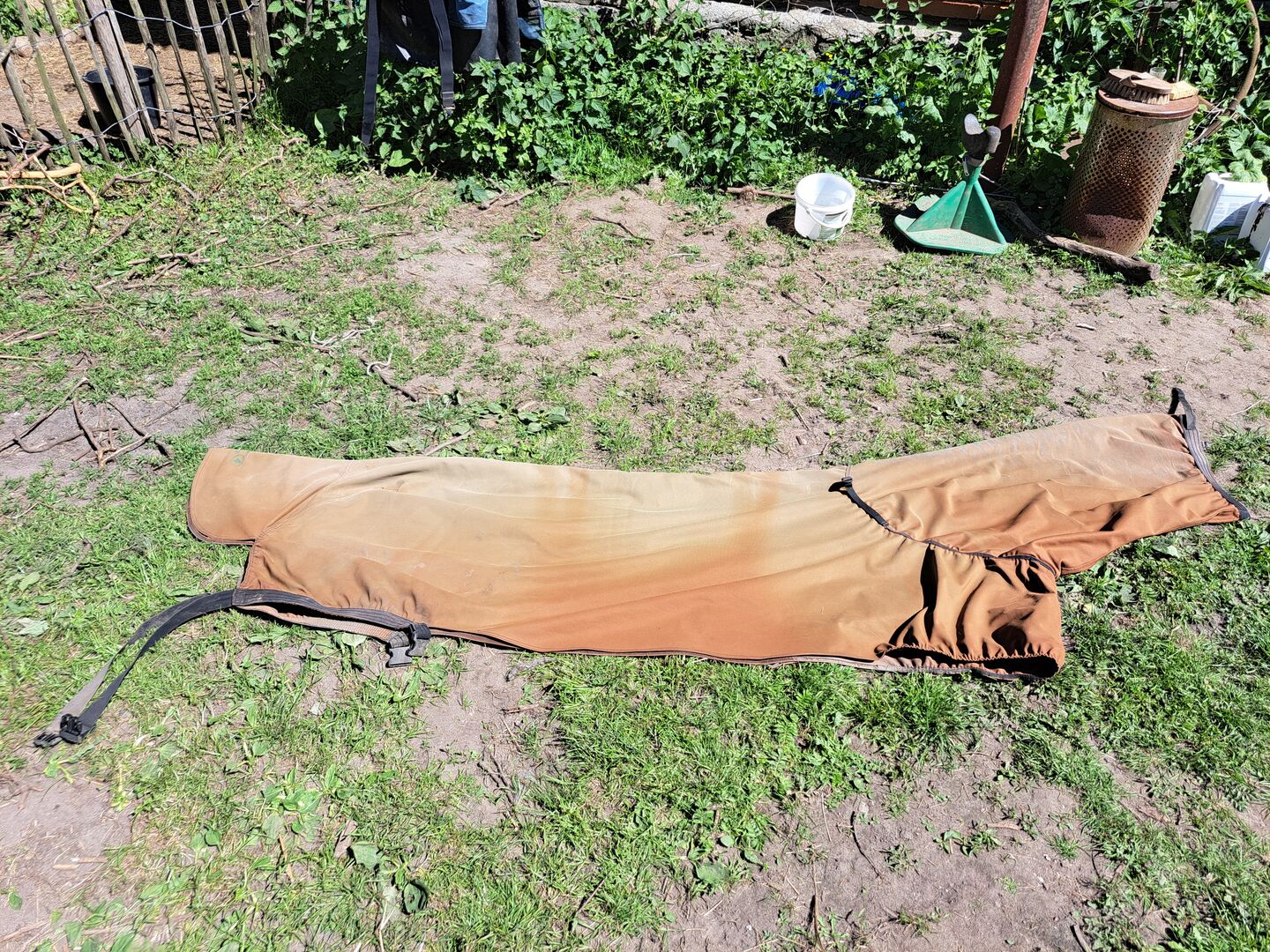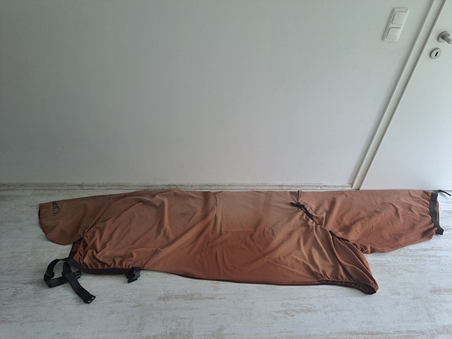 Het heeft twee kleine gaatjes wat de functie niet beperkt en is op één plek gemaaid. Het veulen heeft de staartbeschermer een keer doorgekauwd. Het is een beetje verbleekt door de zon. Het kan verkocht worden met een donkerbruin vliegenmasker. Bijna nieuw zonder gebreken. (30€)
