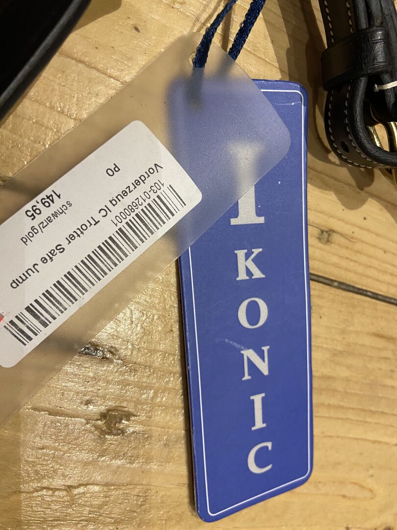 Borstplaat nieuw van Ikonic - Nieuw borstschild of ook wel martingaal genoemd "IC Trotter Safe Jump" in zwart/goud, maat: pony, staat erop, maar is waarschijnlijk verkeerd gelabeld. Zou warmbloed moeten zijn.