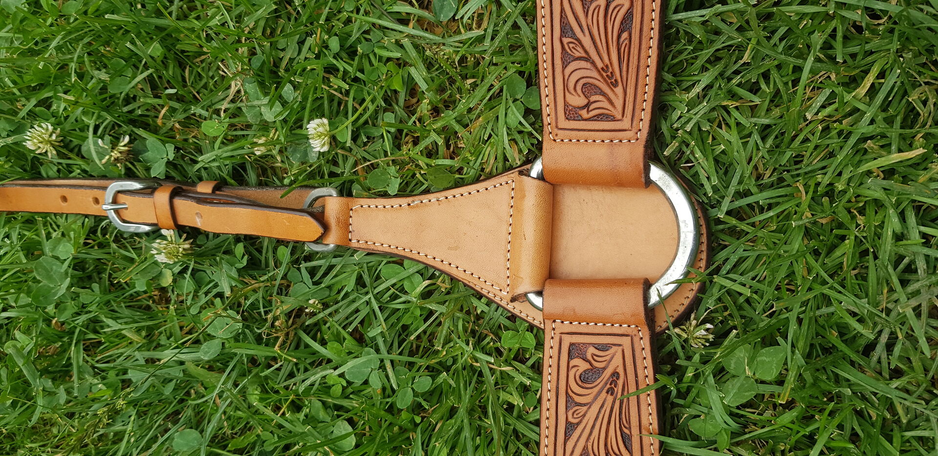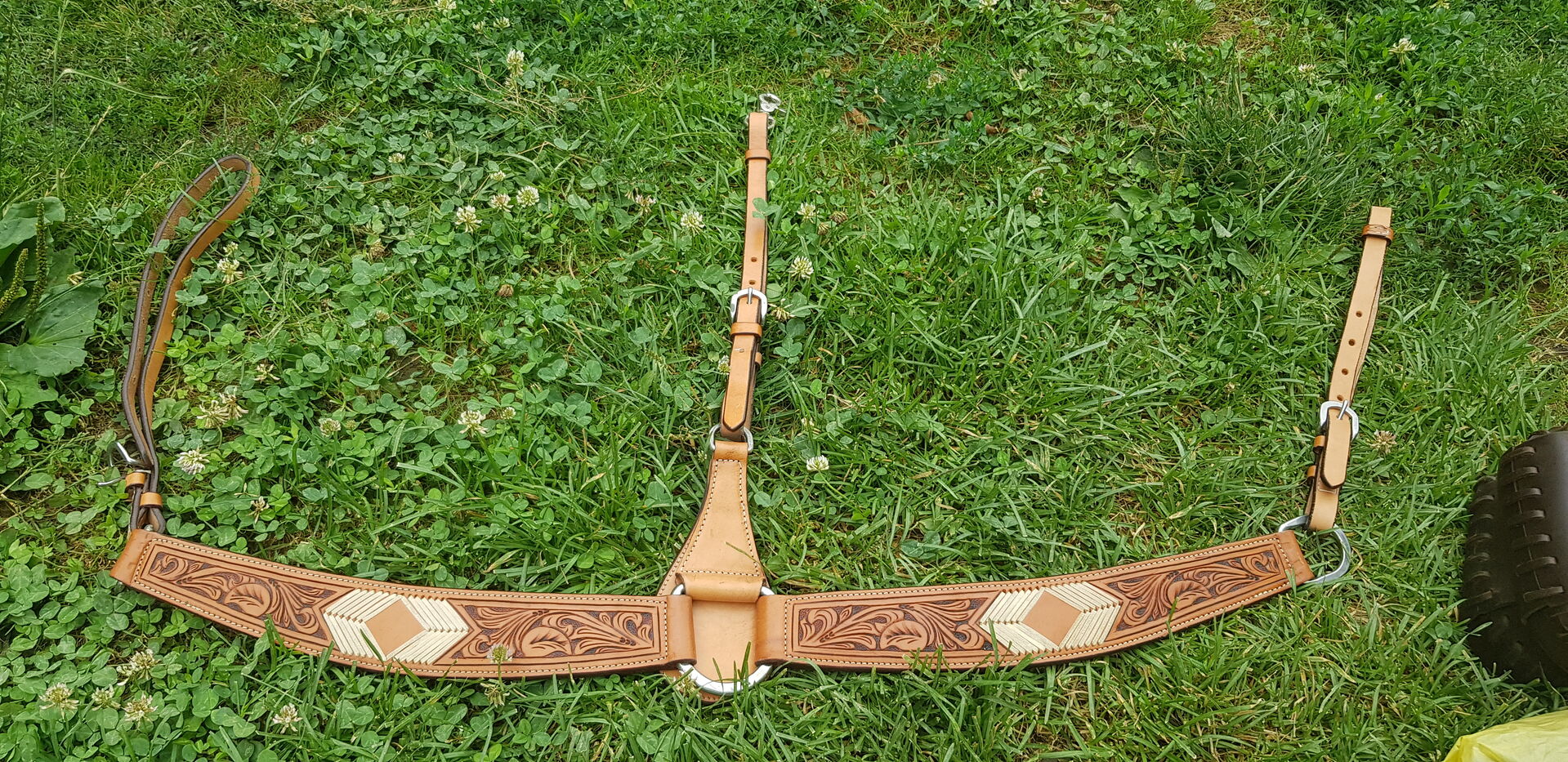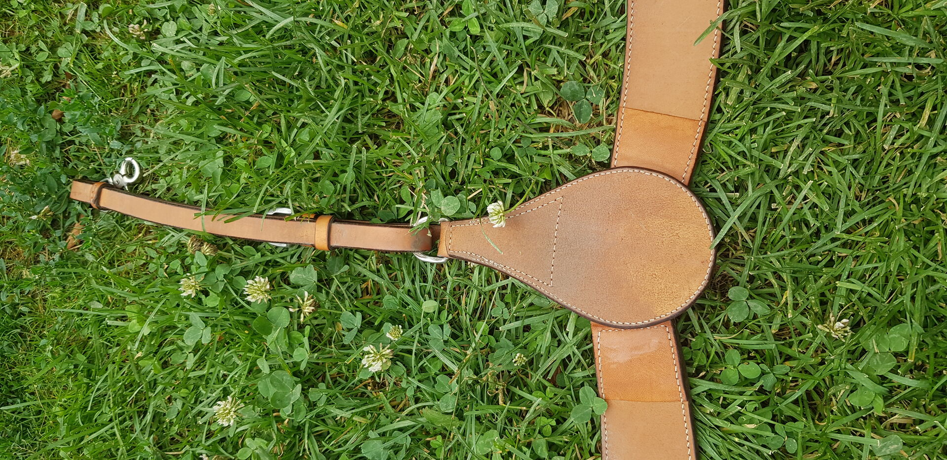 Borstplaat Western klein koudbloed Haflinger Tinker - Eenmaal op borstplaat gezet. Zeer zacht leer. Past iets bredere paarden. (Past mijn sterke Hutsul merrie met 145cm) In de langst mogelijke stand 145cm.