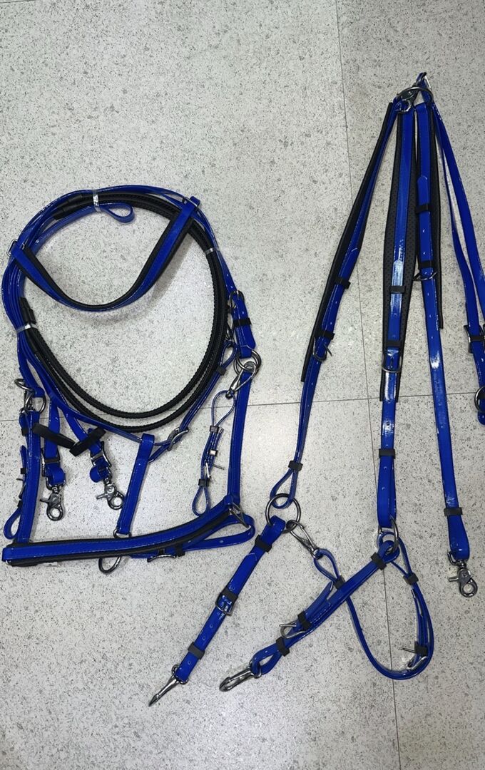 Borststuk, plastron en harnas in Biothane. RAID / uithoudingsvermogen - Borststuk, plastron en harnas in Biothane. RAID / uithoudingsvermogen . 🆕 Het hoofdstel is uitgerust met leren beschermingen aan de voorkant en op de dij. De plastron heeft leren verstevigingen voor extra bescherming. Het harnas is voorzien van rubberen vulling. Alle accessoires zijn gemaakt van roestvrij staal. Blauwe kleur Maat : Vol