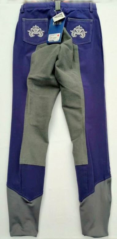 Broek met volledig zitvlak maat 40/L NIEUW - Nieuwe rijbroek maat 40 of L van Busse, model Baccarat met vol zitvlak in navy-grijs, met elastische broekspijpen en strass-applicaties op de achterzakken. Ter vergelijking de maten: taillemaat 75 cm, buitenbeenlengte 98 cm.