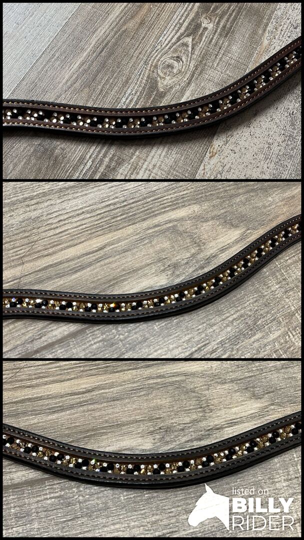 Browband - Nieuwe, ongebruikte wenkbrauwband in vintage look. De wenkbrauwband is lichtbruin aan de rand en wordt donkerbruin naar het midden toe. De glazen steentjes zijn zwart, bruin en zilver en zijn direct op de leren wenkbrauwband gelijmd.