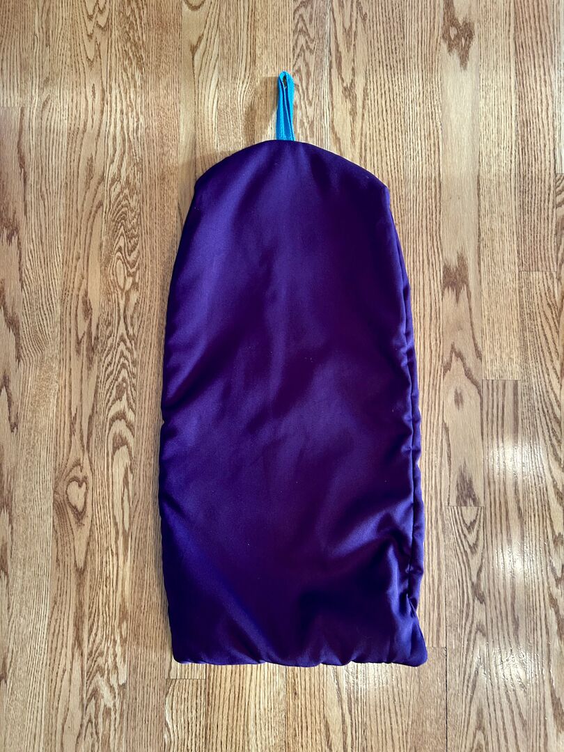 This bridle bag is a purple-burgundy colour with turquoise trim.