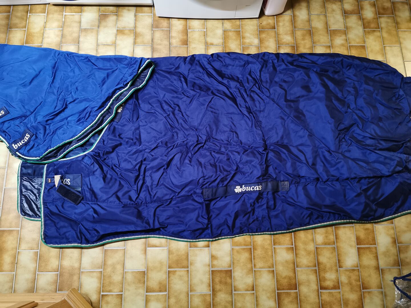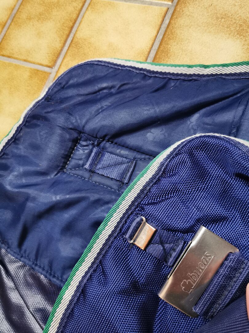Helaas is de tegenhanger van de magneetsluiting aan de binnenkant losgeraakt (zie foto), maar de deken kan nog wel normaal gesloten worden aan de voorkant. Daarnaast is het halsgedeelte helaas gescheurd aan de binnenkant (kan genaaid worden), daarom verkopen we het kleed ook "goedkoper" en is de prijs bespreekbaar. Het kleed kostte nieuw 280€ inclusief het nekgedeelte.