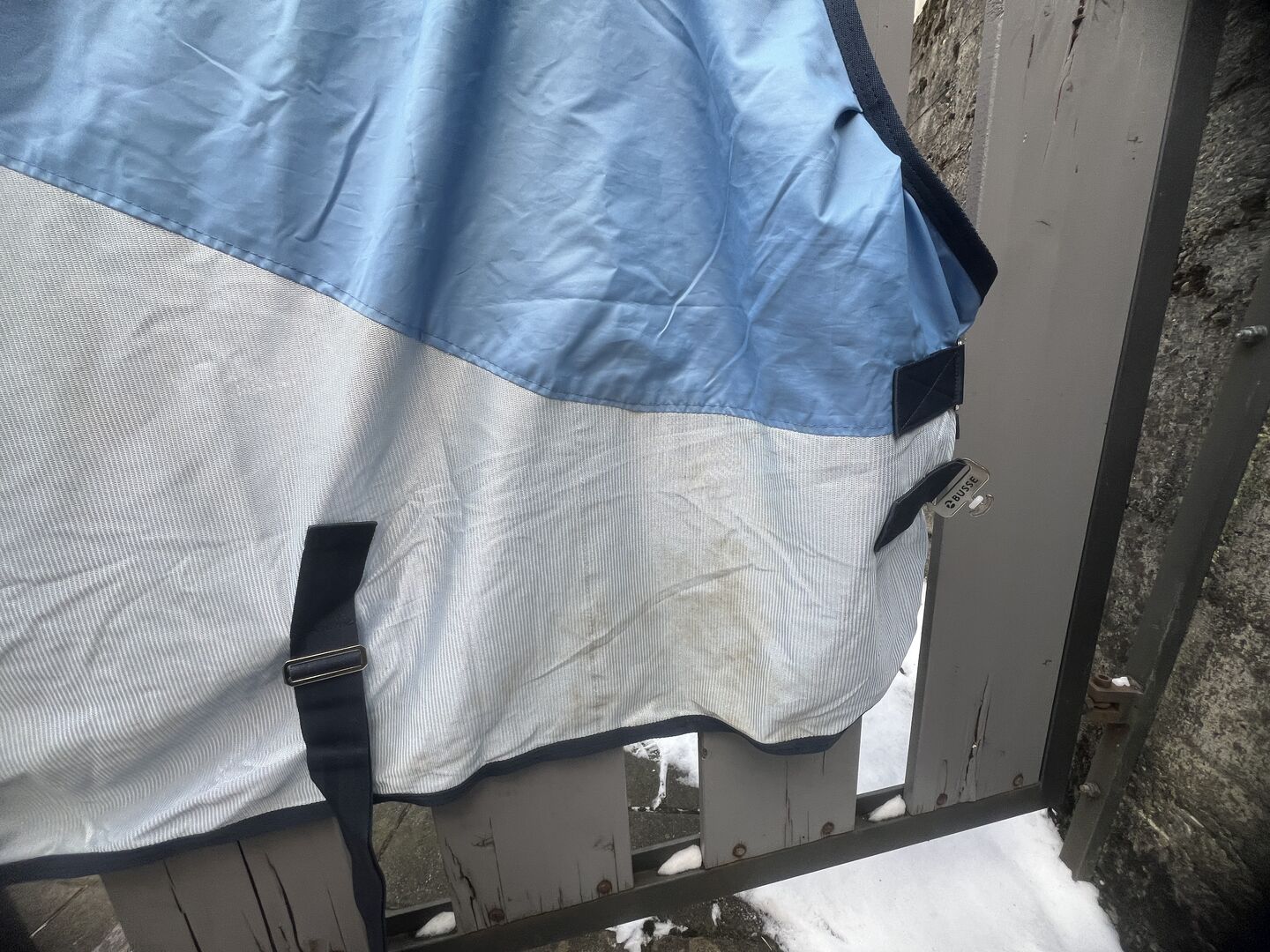BUSSE RAINFLY regendeken, 145 cm, marineblauw - De deken is slechts een paar keer gebruikt. Gebruikt maar in zeer goede, mint conditie en is koud gewassen. Zoals op de foto's te zien is, zijn er helaas wat grasvlekken achtergebleven. Deze hebben geen invloed op de functionaliteit.