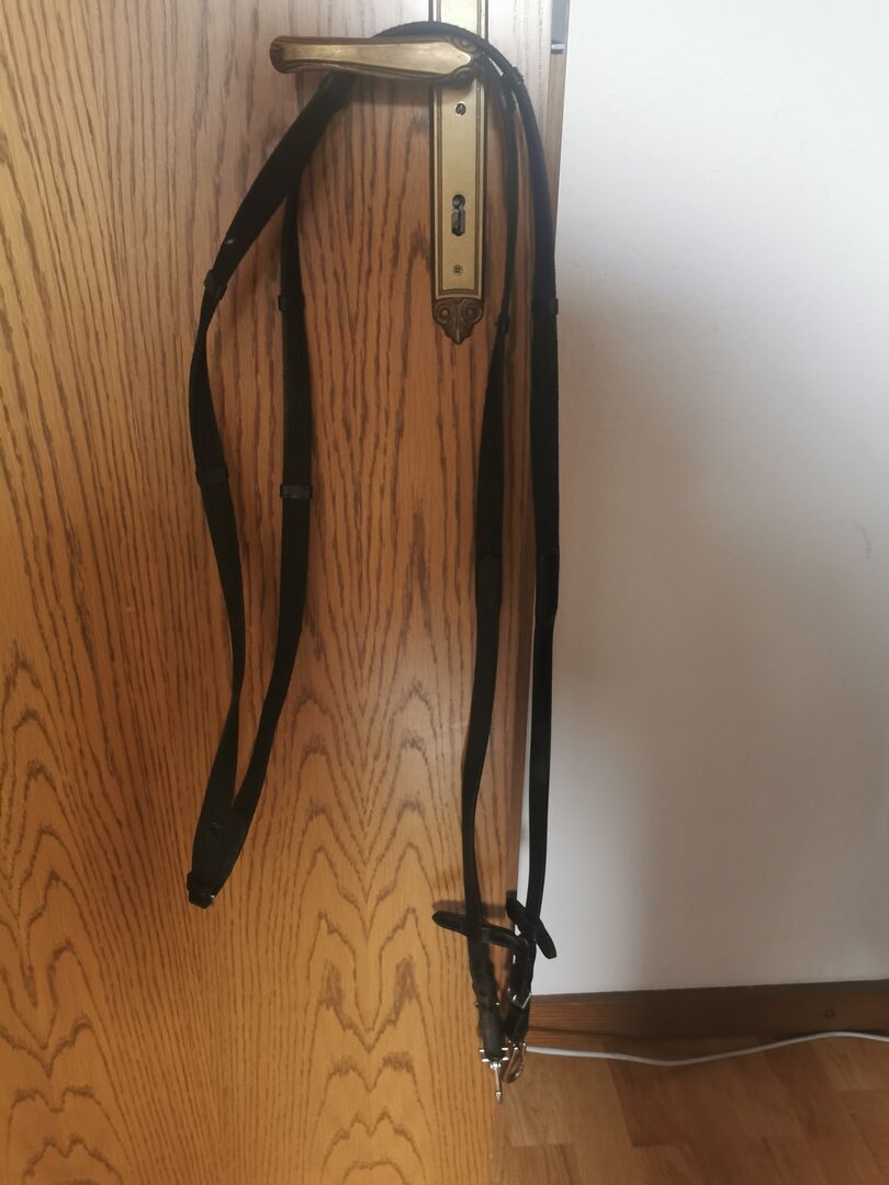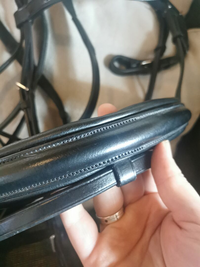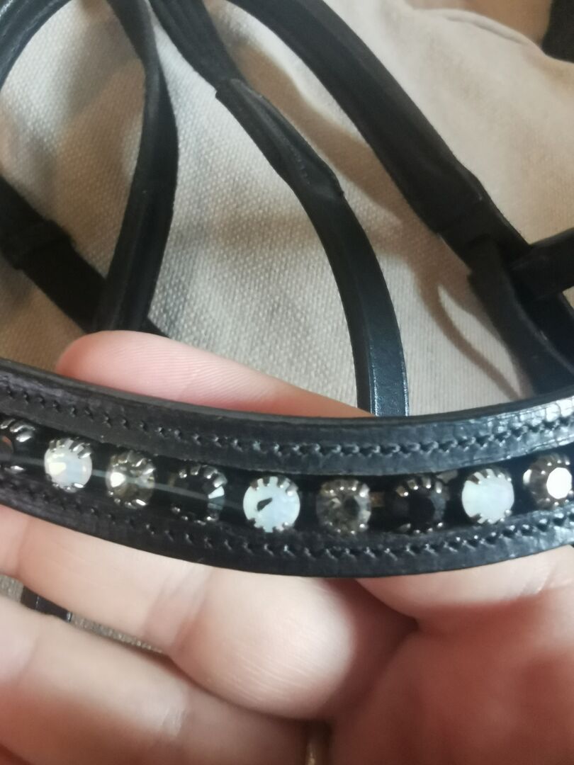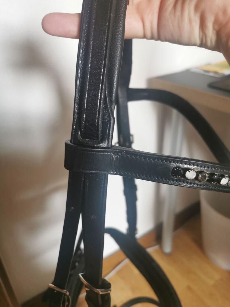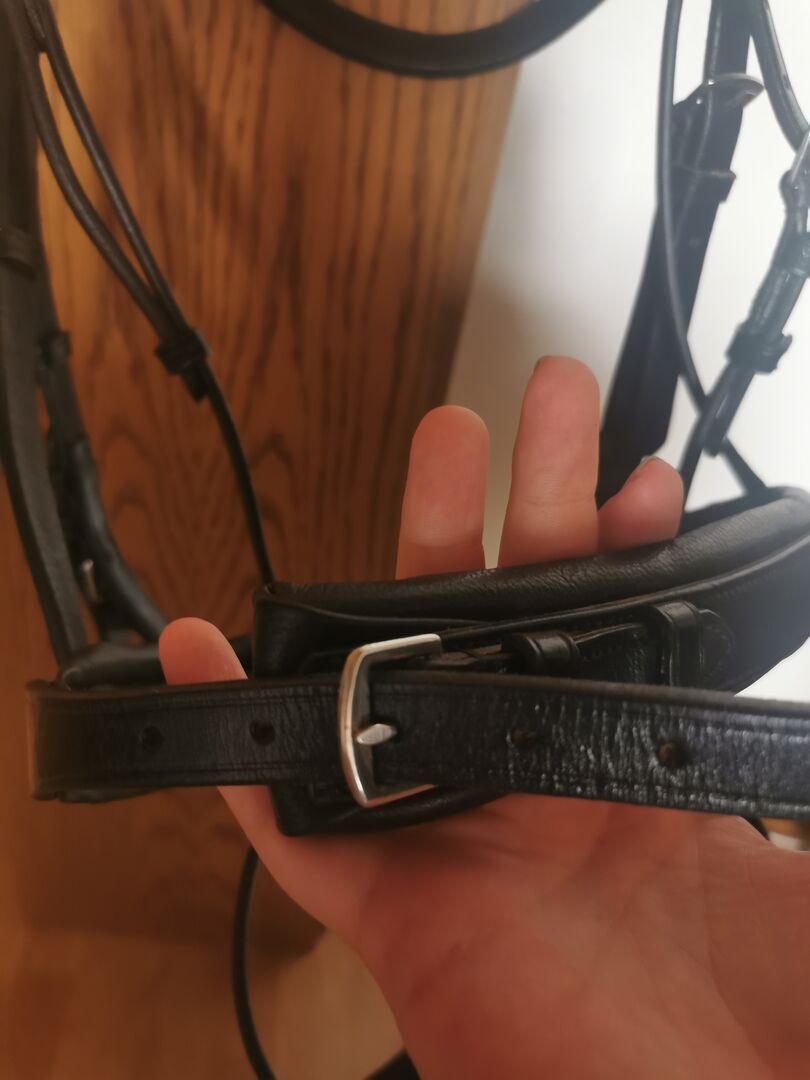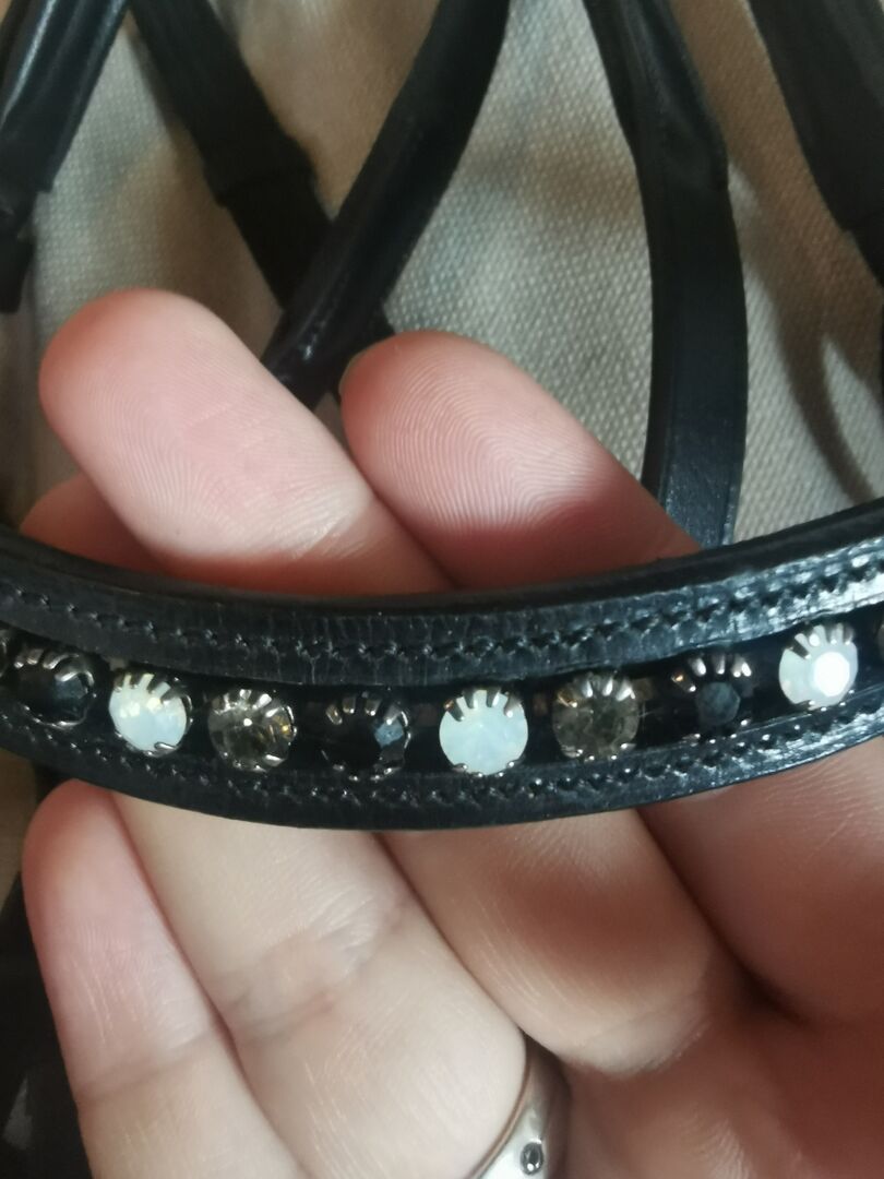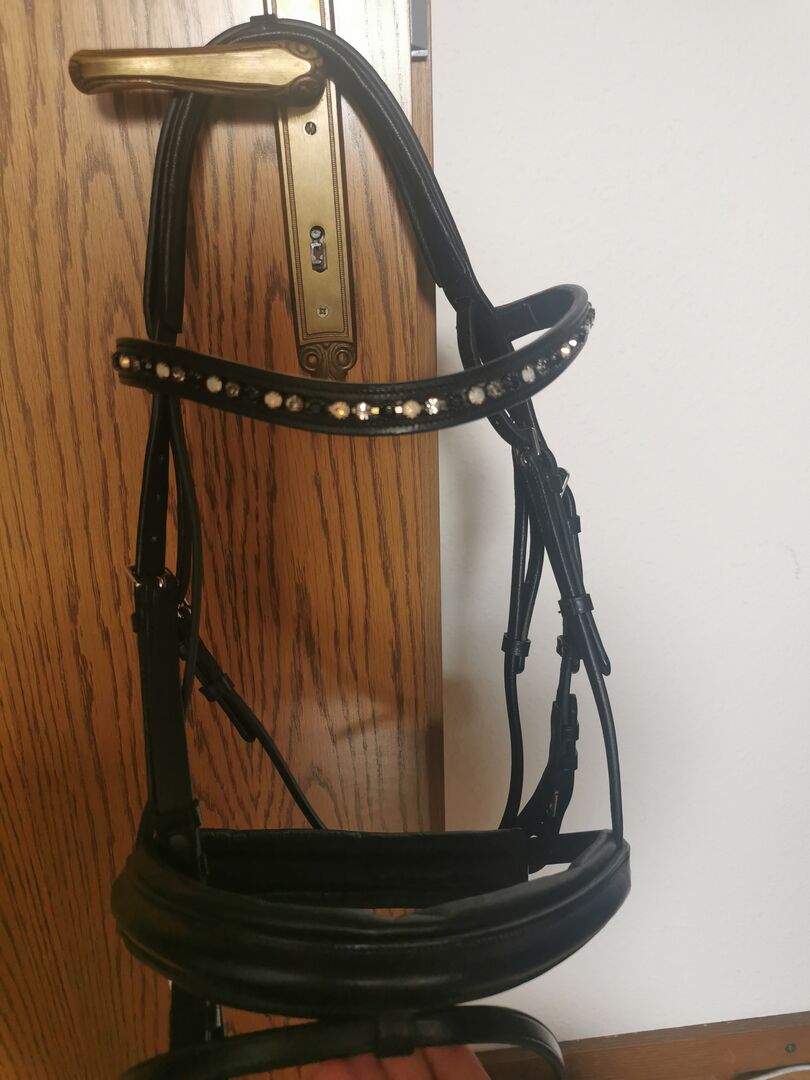 Busse/ Solibel Snaffle Comfort in WB - Weinig gebruikte snaffle in maat WB. - Effen wenkbrauwband met steentjes (één heeft een klein smetje - zie foto's). - Engelse combinatie neusriem met toon-op-toon onderlaag - Caveson loopt over het nekstuk - Inclusief teugels met drukknopen