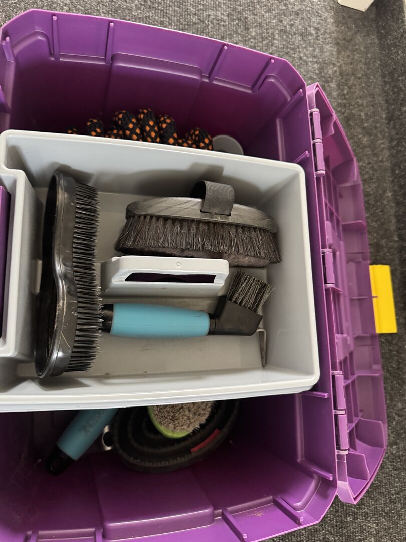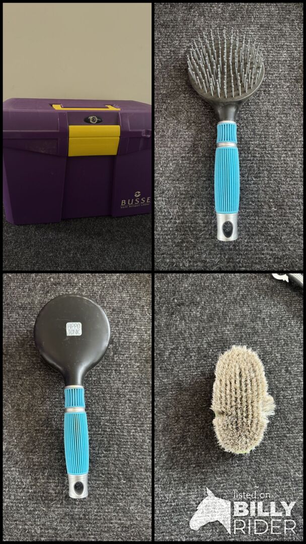 Busse verzorgingsbox in paars met gele sluiting en verzorgingsset - Ik verkoop mijn Busse verzorgingsbox in mooi paars met gele sluiting. Wordt geleverd met verschillende accessoires (zelf gemonteerd) maar alles wat belangrijk is zit erbij. Ik bied ook een halstertouw van 2 meter aan. De grooming items en de box zijn in gebruikte maar goede staat. Neem contact met me op als je vragen hebt