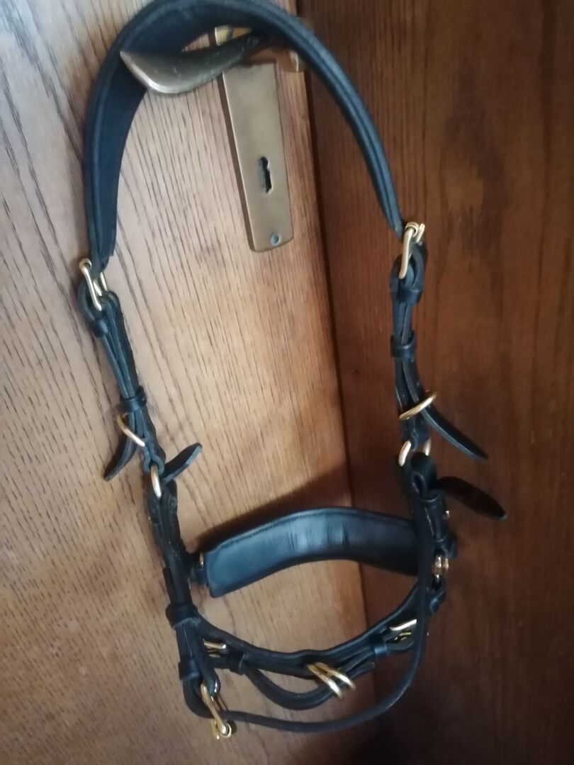 Cavesson all in one van Moorhof - Zwart leer met koperen ringen. Geweldig vakmanschap, super leer. 4 keer gebruikt Glijdt uit op de neus van mijn merrie. Maat Cob /Warmbloed