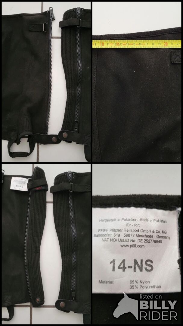 Chaps van Pfiff in maat 14NS - Ik verkoop een paar zwarte rijbroeken van Pfiff in maat 14NS. Ze zijn maar een paar keer gedragen en zijn daarom nog in zeer goede gebruikte tot mint conditie. De originele prijs was 25,00 euro. Voor afmetingen zie foto 4 en 5.